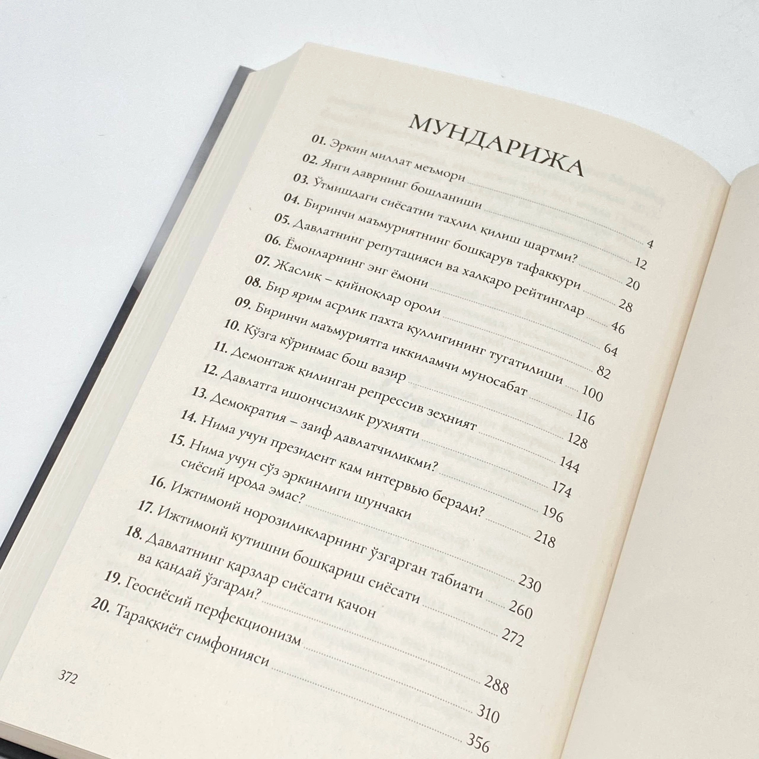 Muallif ushbu asarni bir necha oʻn yillik ilmiy va tahliliy izlanishlari natijasi sifatida taqdim etadi. Kitobda Oʻzbekiston jamiyati va davlatchiligining shakllanish jarayonlari, siyosiy tafakkur evolyutsiyasi, boshqaruv madaniyati, jamiyat zehniyati hamda qadriyatlar masalasi atroflicha tahlil qilingan.