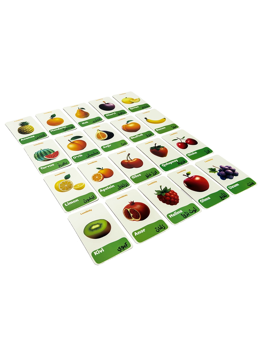 Ushbu mavzuli rasmli kartochkalar bolalar rivojlanishi uchun maxsus ishlab chiqilgan bo‘lib, turli yo‘nalishlarni o‘z ichiga oladi: hayvonlar, mevalar, o‘yinchoqlar, kasblar, ranglar va boshqa mavzular. Kartochkalar bolaning so‘z boyligini oshiradi, dunyoqarashini kengaytiradi, tafakkuri va nutq rivojiga ijobiy ta’sir ko‘rsatadi.