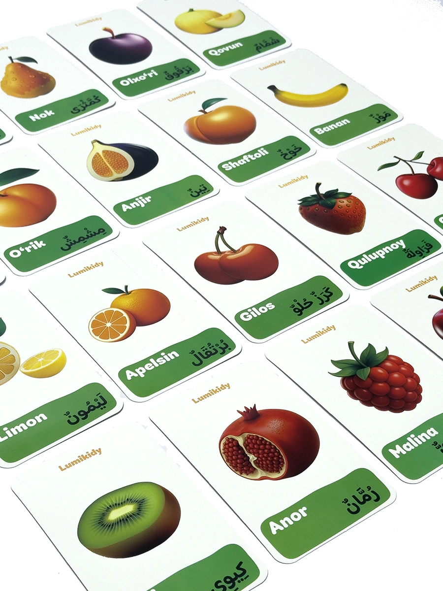 Rangli va chiroyli dizayn kichkintoylarning e’tiborini tortadi, ularni o‘rganishga qiziqtiradi hamda ta’lim jarayonini yanada samarali qiladi. Ushbu kartochkalar uy sharoitida ta’lim berish uchun qulay va foydali qo‘shimcha vosita bo‘lib, ota-onalar va tarbiyachilar uchun ham juda amaliy hisoblanadi.