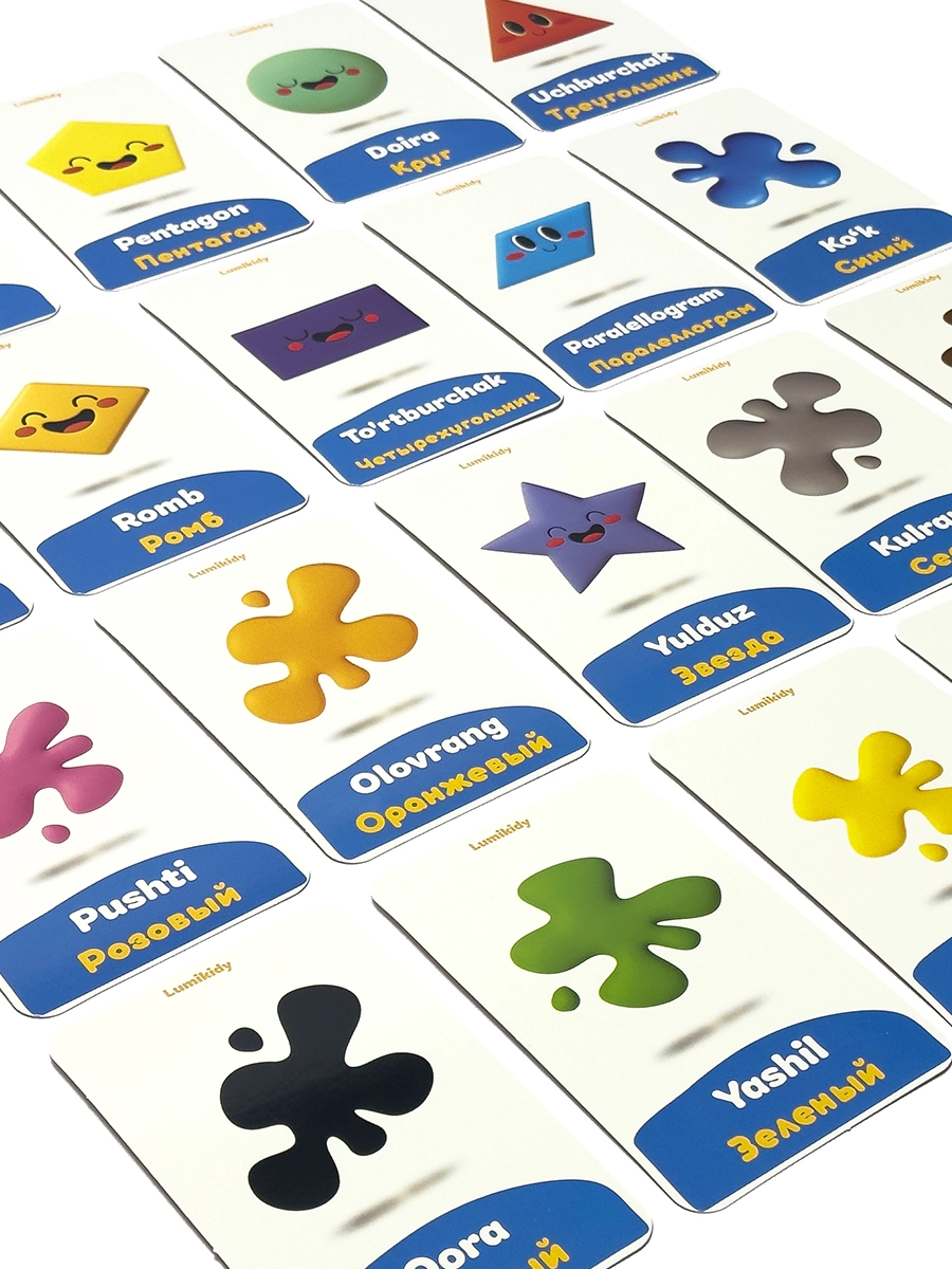 Bolalar rivojlanishi uchun kartochkalar: Ranglar va shakllar - Цвета и Формы (rus tilida)