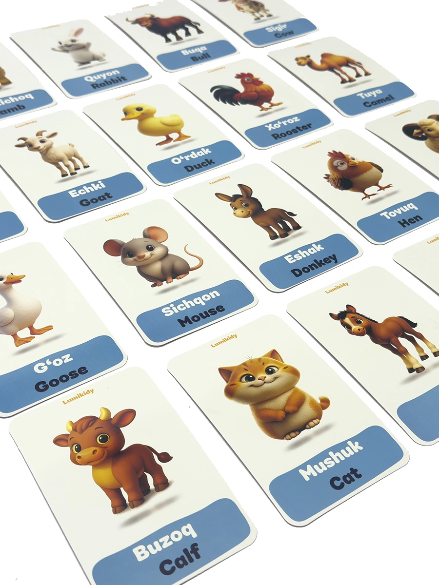 Rangli va chiroyli dizayn kichkintoylarning e’tiborini tortadi, ularni o‘rganishga qiziqtiradi hamda ta’lim jarayonini yanada samarali qiladi. Ushbu kartochkalar uy sharoitida ta’lim berish uchun qulay va foydali qo‘shimcha vosita bo‘lib, ota-onalar va tarbiyachilar uchun ham juda amaliy hisoblanadi.