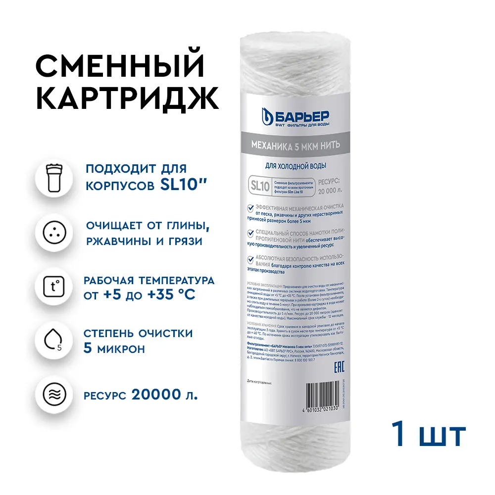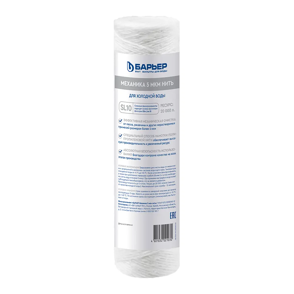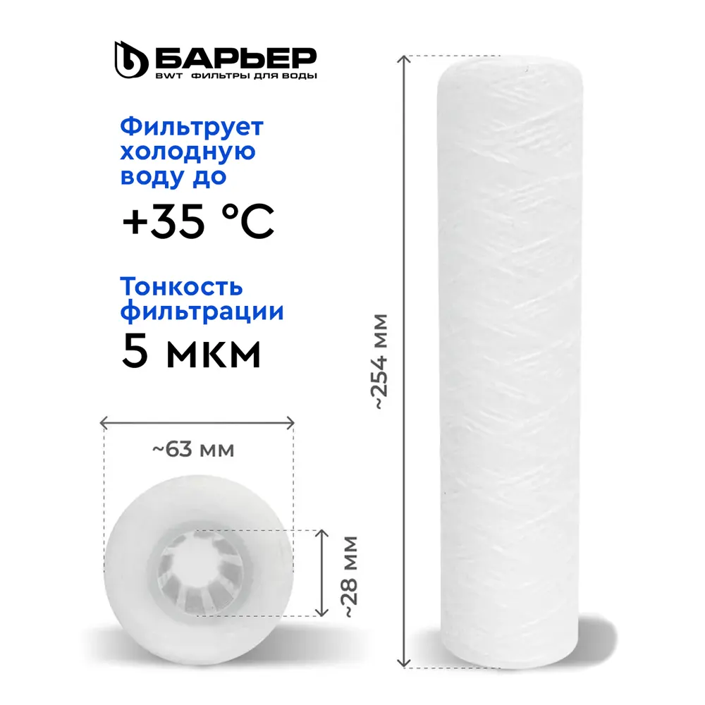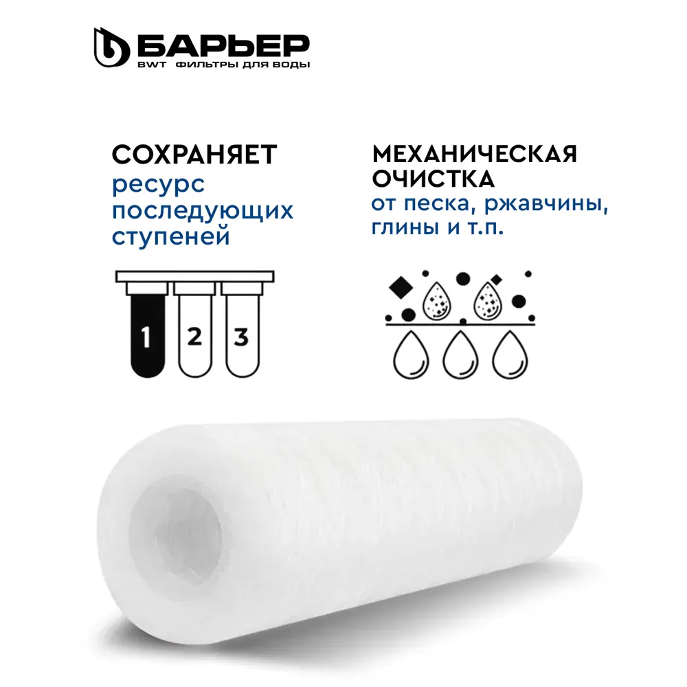 Картридж БАРЬЕР «Механика 5 мкм нить» задерживает механические примеси до 5 мкм (песок, ржавчину и другие механические примеси).