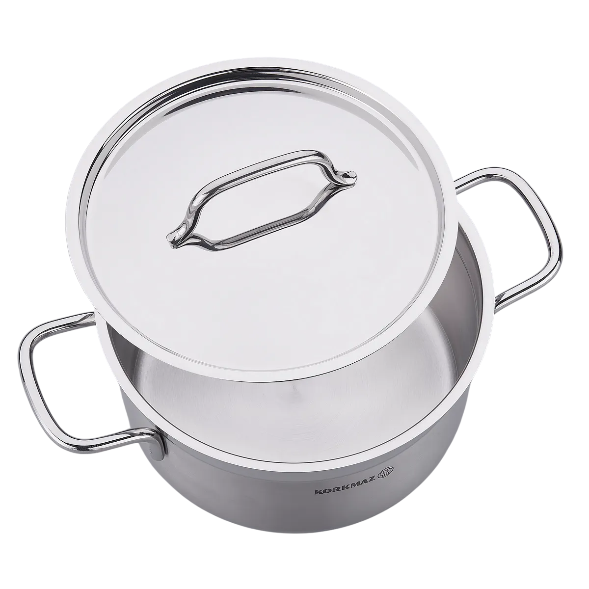 Korkmaz Alfa A1025 сочетает стиль и функциональность. Её многослойное капсульное дно (сталь + алюминий + сталь) обеспечивает быстрое и равномерное нагревание, позволяя готовить блюда с минимальными затратами энергии. Крышка из нержавеющей стали плотно прилегает к корпусу, удерживая пар и тепло внутри — это помогает сохранить сочность, аромат и структуру продуктов.