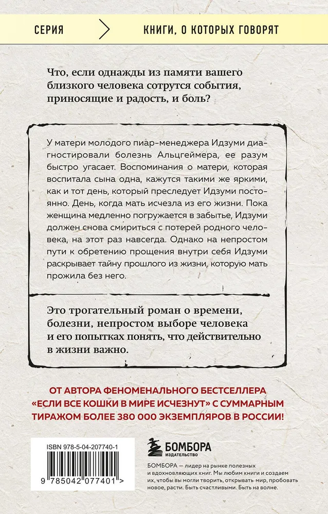 Трогательный роман от известного во всем мире автора. Это согревающая и глубокая книга о смысле жизни. У матери главного героя болезнь Альцгеймера, и женщина забывает даже собственного сына. Заботясь о маме, Идзуми узнает о её тайном прошлом и жизни, которую мать прожила без него. Роман на важную тему, которую автор раскрывает через взаимоотношения тяжелобольной матери с сыном. Время быстротечно, автор покажет, почему нужно ценить каждую счастливую минуту.