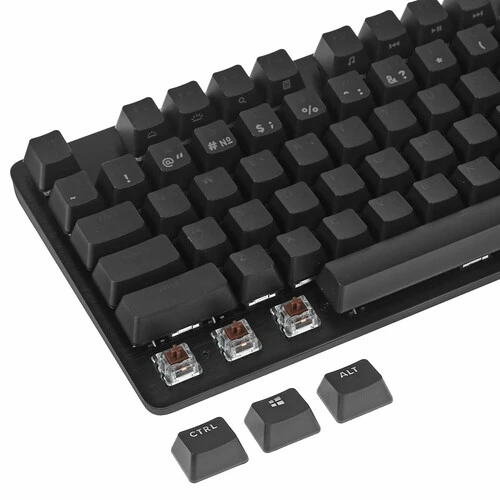 Проводная клавиатура Logitech G413 TKL SE [920-010447] соответствует компактному форм-фактору TKL (80%) и обеспечивает высокую производительность в играх. Она оснащена 87 клавишами с механическими переключателями Kailh Brown с приятным тактильным откликом, а колпачки клавиш выполнены из износостойкого материала PBT. Для удобства игры в темноте предусмотрена белая светодиодная подсветка, а корпус из металла и пластика делает устройство устойчивым к механическим повреждениям. Подключение осуществляется через проводной интерфейс USB Type-A, длина кабеля — 1.8 м. Клавиатура поддерживает 6KRO (одновременное нажатие шести клавиш), имеет Fn-клавишу, формат — TKL, конструкция — скелетон, язык раскладки — русский и английский, низкопрофильные клавиши отсутствуют, цифровой блок и подставка под запястье отсутствуют. Питание осуществляется от USB, в комплекте — документация.