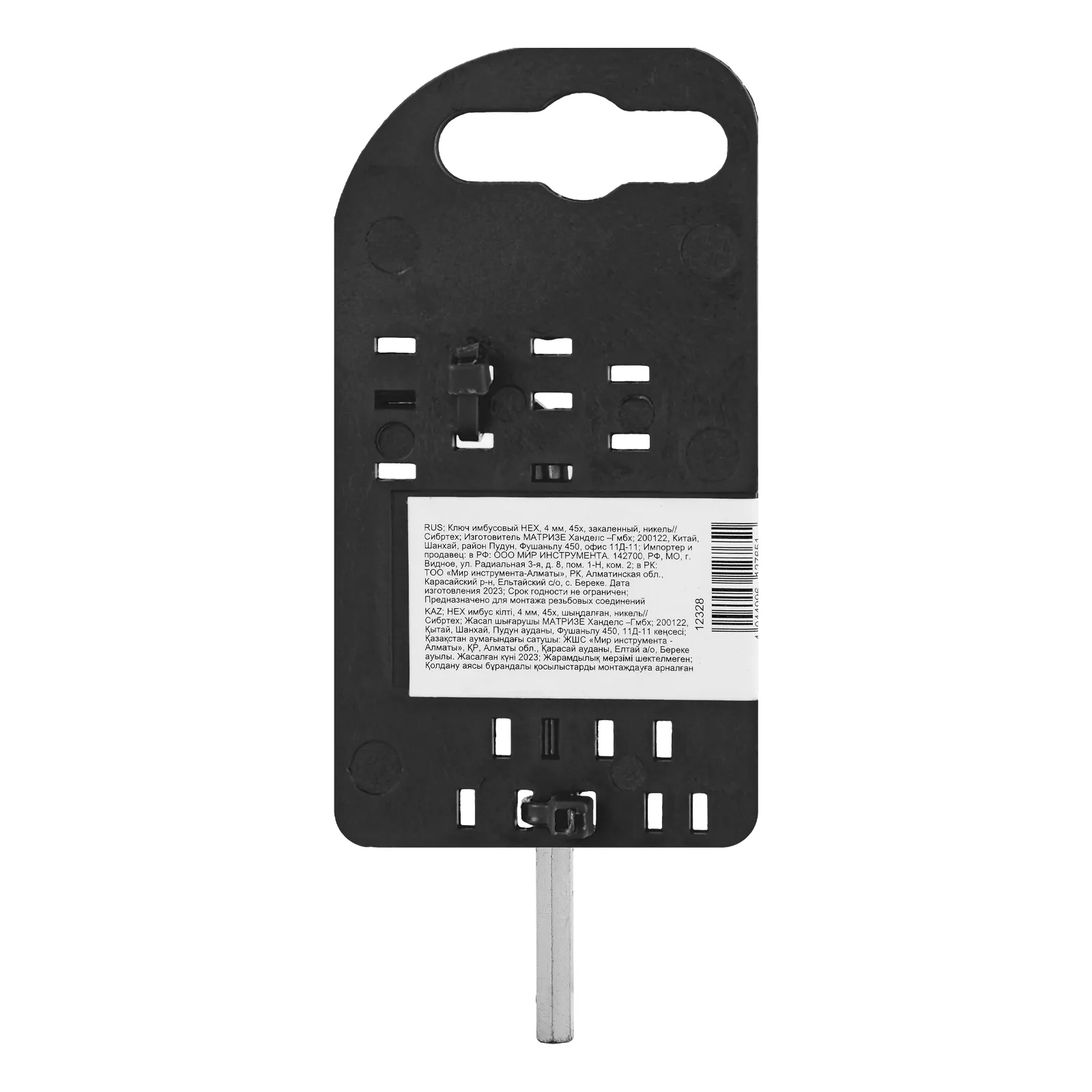Сибртех 12328 — это надёжный профессиональный имбусовый ключ размером 4 мм, выполненный из закалённой стали марки 45Х с никелированным покрытием. Инструмент предназначен для монтажа и демонтажа крепежа с внутренним шестигранным шлицем HEX.