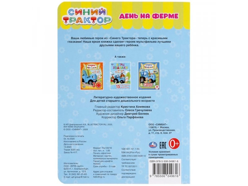 Книжка с глазками Синий трактор. День на ферме ТМ УМка непременно понравится маленькому поклоннику одноимённого мультсериала: - интересный сюжет по мотивам м/ф - пластиковые объёмные глазки - красочные иллюстрации - любимые персонажи