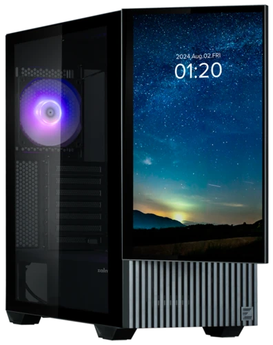Встроенный 15,6-дюймовый поворотный дисплей на передней панели не только придаёт корпусу футуристичный вид, но и позволяет отслеживать системные параметры в реальном времени.