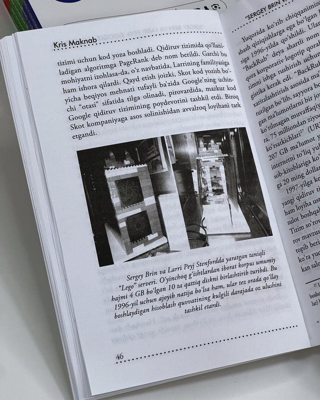 Унинг асосчилари Сергей Брин ва Ларри Пейж гигант корпорацияни яратгунга қадар қандай қийинчиликларни енгиб ўтишди? Одамларга қулай хизмат кўрсатиш усулларини ишлаб чиқиш учун қандай чораларни қўллашди? Ушбу китоб шу каби саволларга жавоб беради.