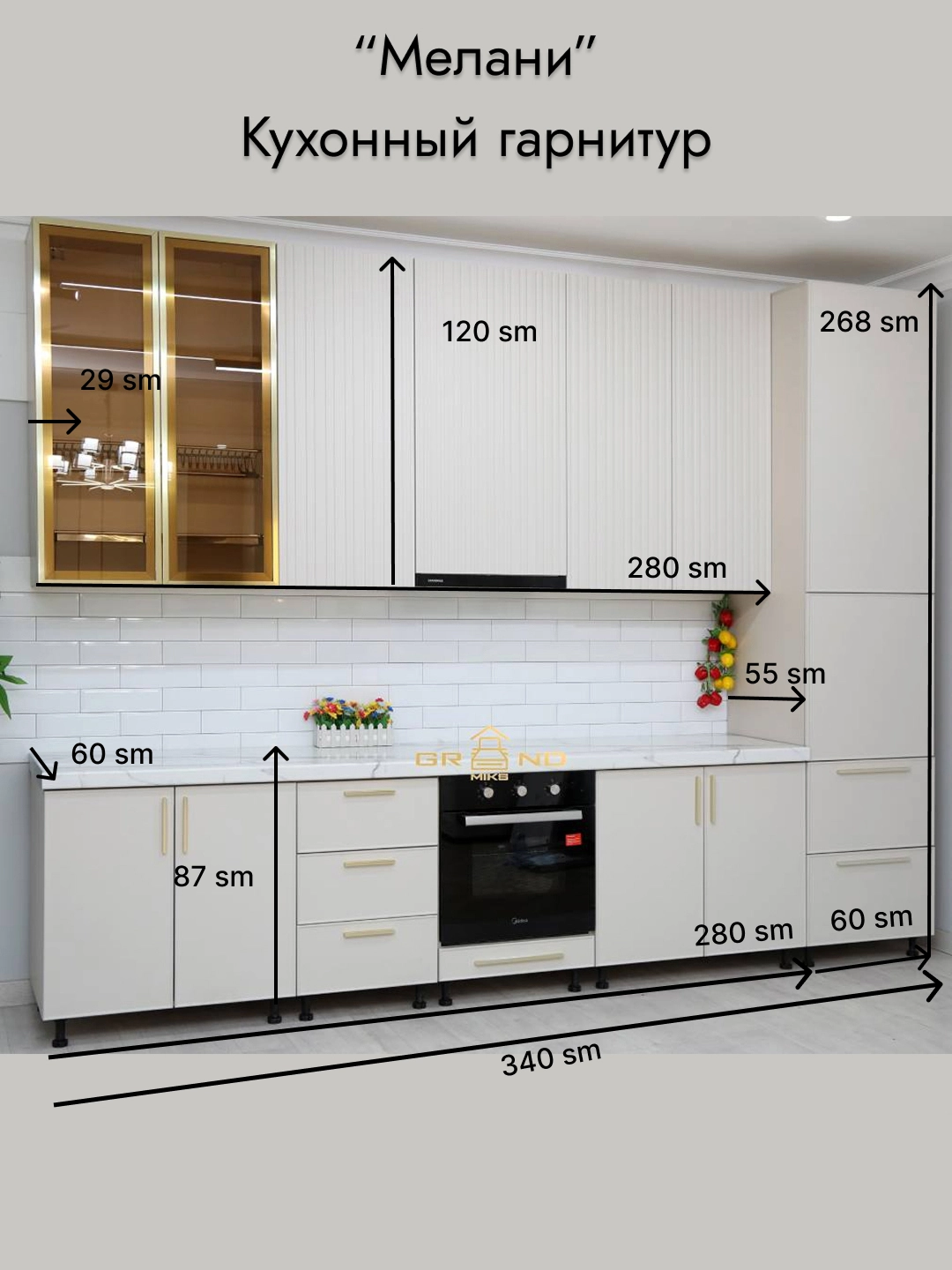 Melani oshxona garnituri — zamonaviy va funksional mebel to‘plami bo‘lib, Qozog‘istondagi Grand Miks fabrikasi tomonidan ishlab chiqarilgan. Ushbu model uslub, qulaylik va sifatni qadrlaydiganlar uchun ideal tanlovdir. Garniturning dizayni o‘ylangan, ekologik xavfsiz va kundalik foydalanish uchun juda qulay.
