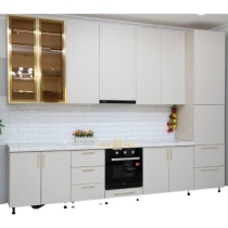 Garnitur bej rangida tayyorlangan: korpus ekologik plitadan, fasadlar esa mustahkam MDF materialidan yasalgan. Bej tus uyga iliqlik baxsh etadi va istalgan interyerga mos keladi.