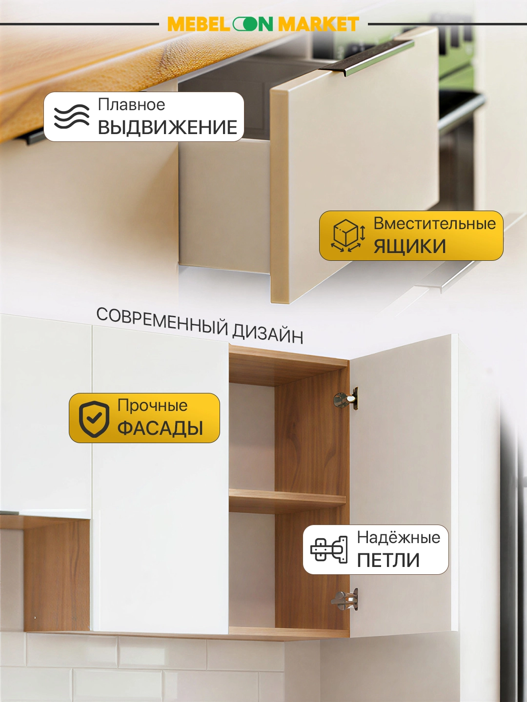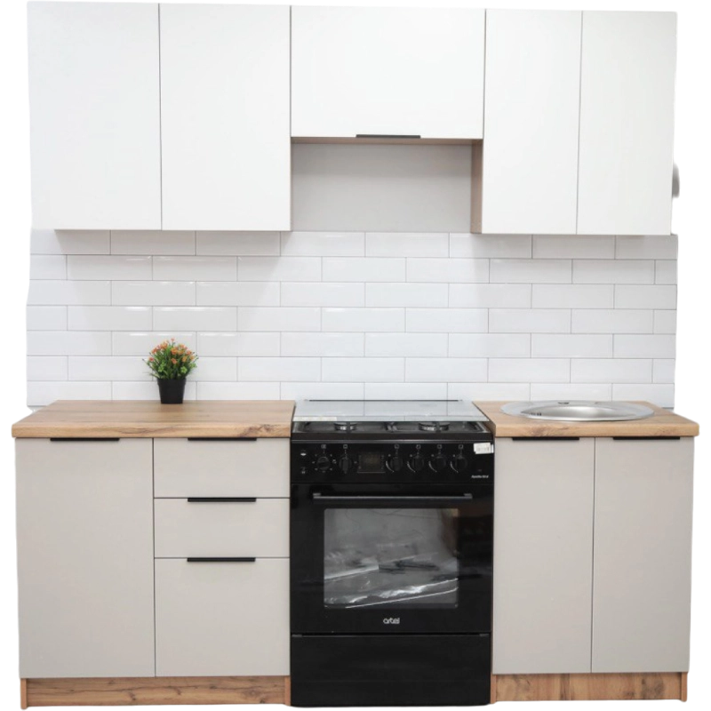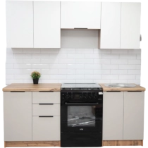 Garnitur dub Votan korpusga ega, yuqori fasadlar — oq, pastki fasadlar — fantom rangida. LDSP materiali mustahkam, uzoq xizmat qiladi va parvarishi oson. Bej va kulrang tonlar oshxona interyeriga zamonaviylik va noyoblik qo‘shadi.