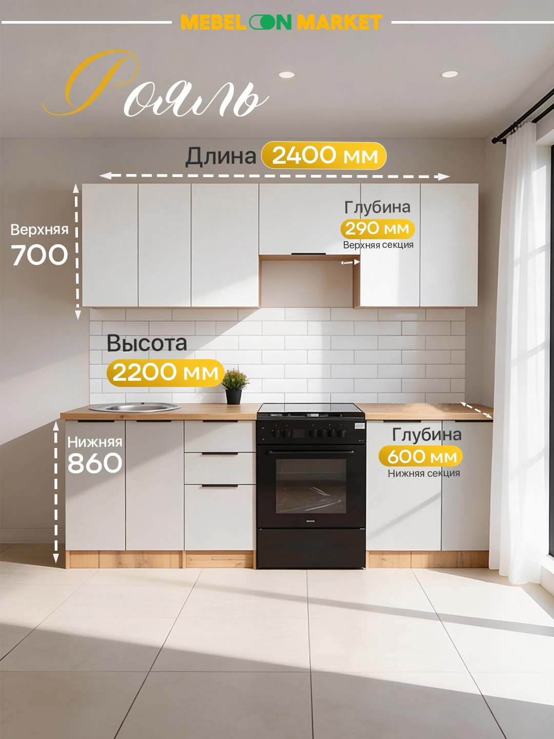 “Oshxona garnituri ‘Royal’” — Grand Miks (Qozog‘iston) fabrikasida ishlab chiqarilgan zamonaviy va funksional mebel to‘plamidir. Ushbu garnitur oshxonani qulay va chiroyli tarzda jihozlash uchun ideal tanlovdir. U oshxona buyumlari va mahsulotlarini tartibli saqlashga imkon beradi.
