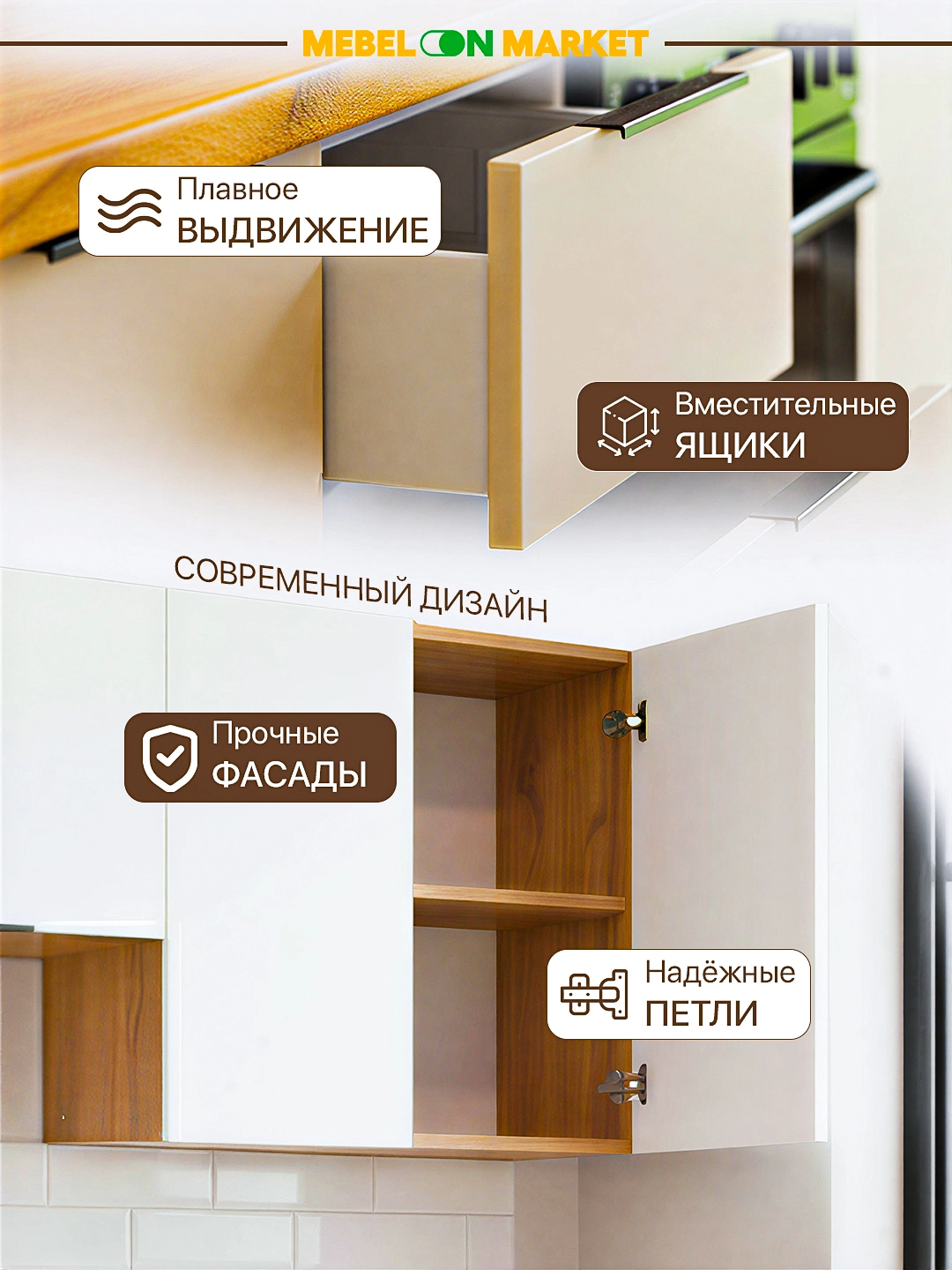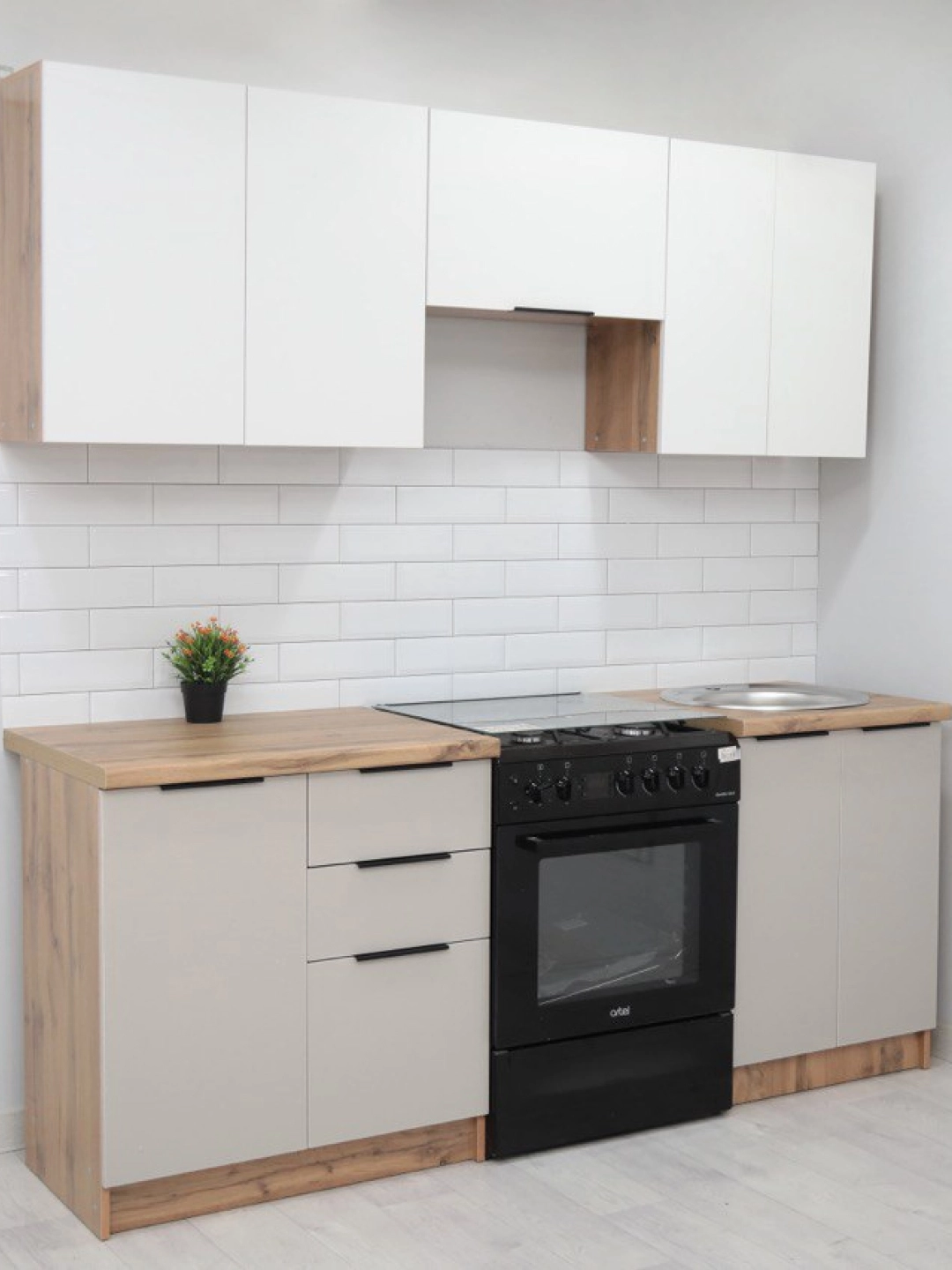 Garnitur dub Votan korpusga ega, yuqori fasadlar — oq, pastki fasadlar — fantom rangida. LDSP materiali mustahkam, uzoq xizmat qiladi va parvarishi oson. Bej va kulrang tonlar oshxona interyeriga zamonaviylik va noyoblik qo‘shadi.