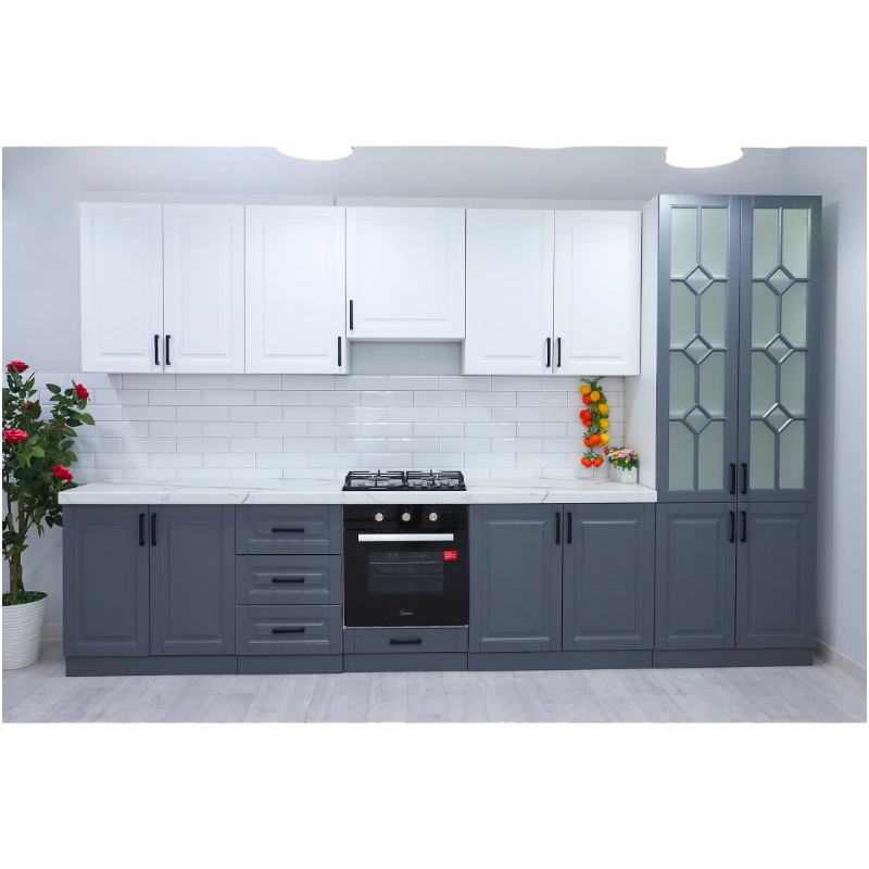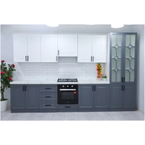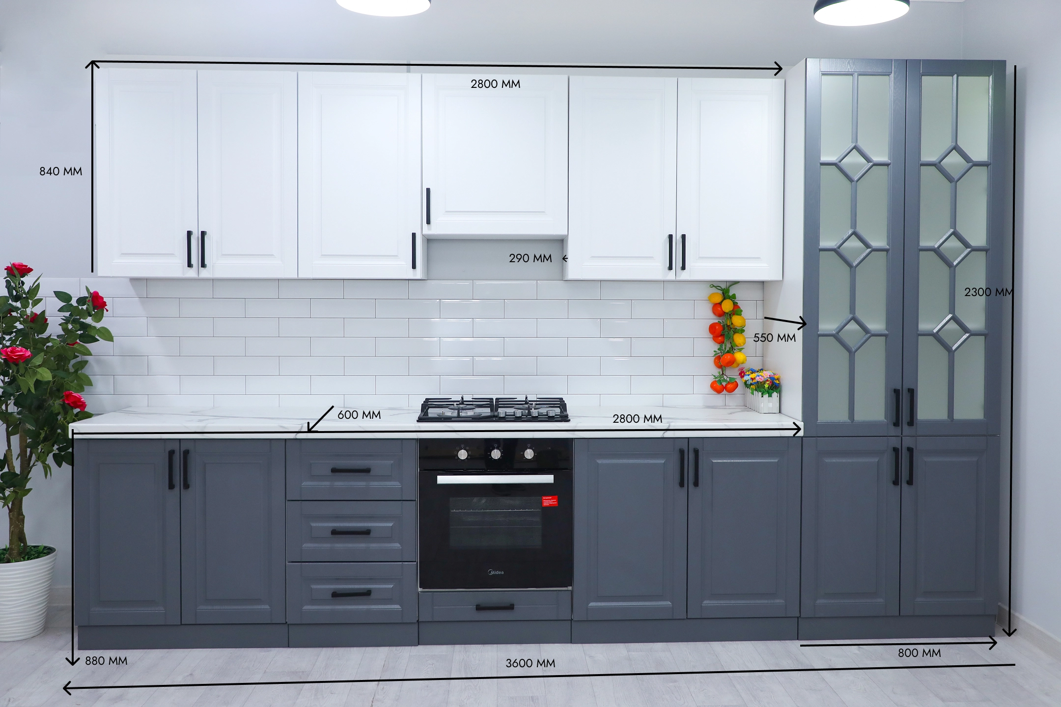 Qozog‘istonda ishlab chiqarilgan zamonaviy oshxona garniturlari o‘ylangan dizayn, funksionallik va sifatli materiallar bilan ajralib turadi. Mebel modulli formatda tayyorlangani sababli, har qanday oshxona rejasiga mos ravishda to‘g‘ri konfiguratsiyani tanlash juda oson. Matte grafit fasadlar va oq korpus kombinatsiyasi zamonaviy, chiroyli va yorug‘ interyer yaratadi.