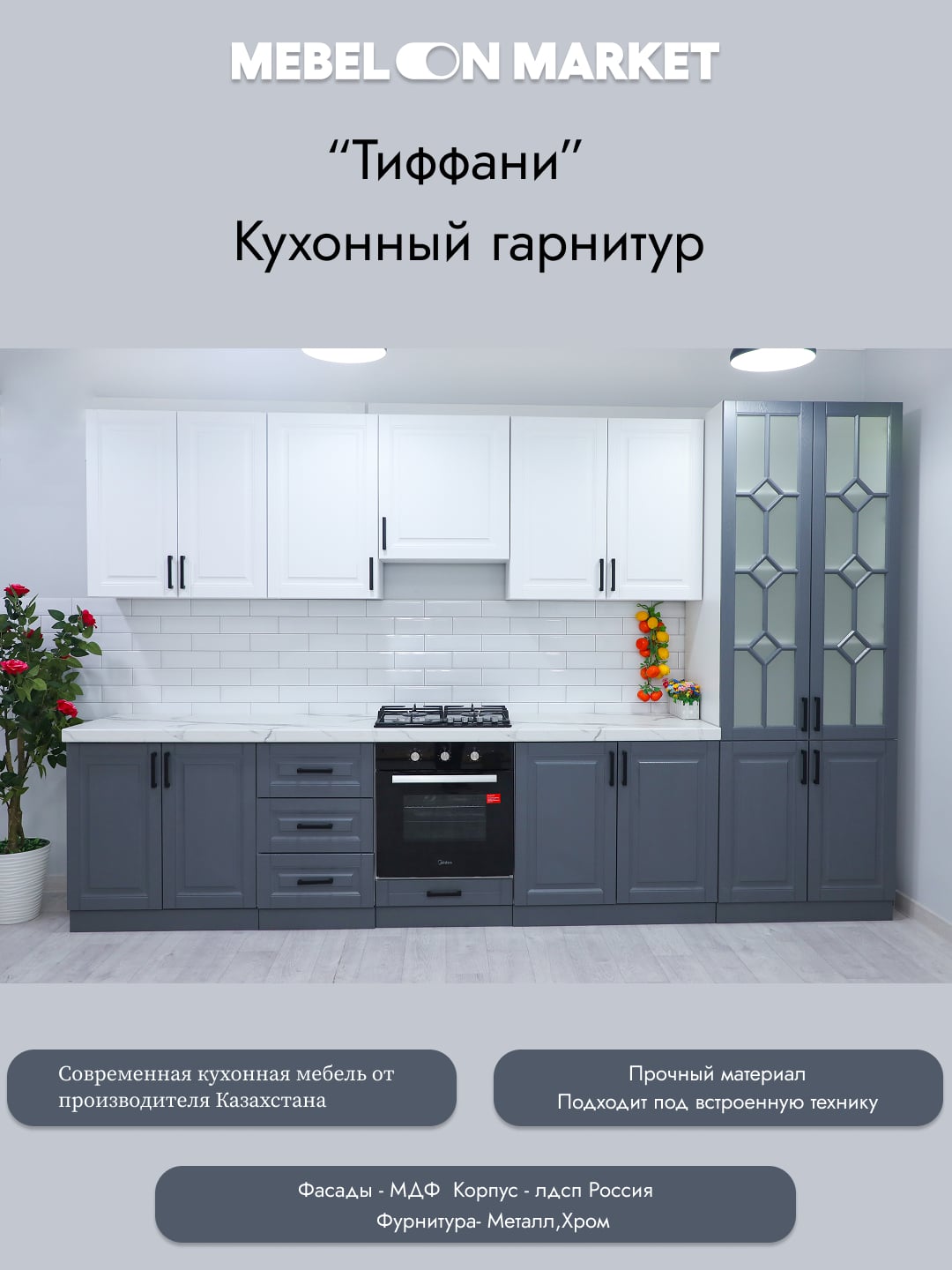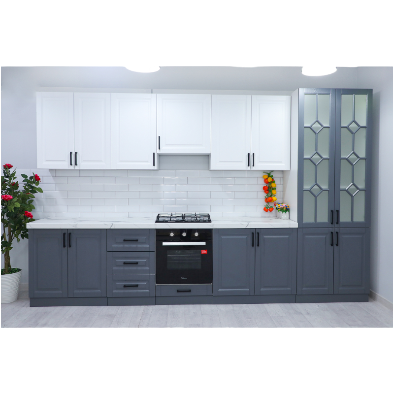 Кухонные гарнитуры производства Казахстана — это сочетание продуманного дизайна, удобства и качественных материалов. Модульная система позволяет легко подобрать оптимальную конфигурацию для кухни любого размера. Матовые графитовые фасады в дуэте с белым корпусом создают современный, стильный и визуально лёгкий интерьер.