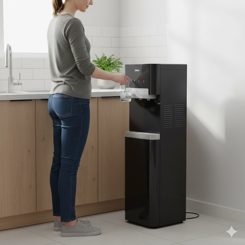 Pastdan butilka yuklash: og‘ir butilkalarni yuqoriga ko‘tarmasdan osongina almashtirish, har qanday yosh va jismoniy tayyorgarlikdagi odamlar uchun qulay.