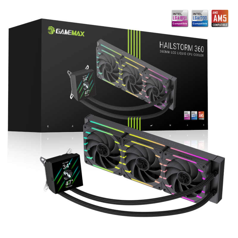 GameMax Hailstorm 360 BK CPU Liquid Cooler — это высокоэффективная AIO (All‑in‑One) система жидкостного охлаждения, предназначенная для мощных процессоров. Она обеспечивает стабильное охлаждение даже при высокой нагрузке, выделяется современным дизайном с LCD-дисплеем, ARGB-подсветкой и широкой совместимостью с платформами.