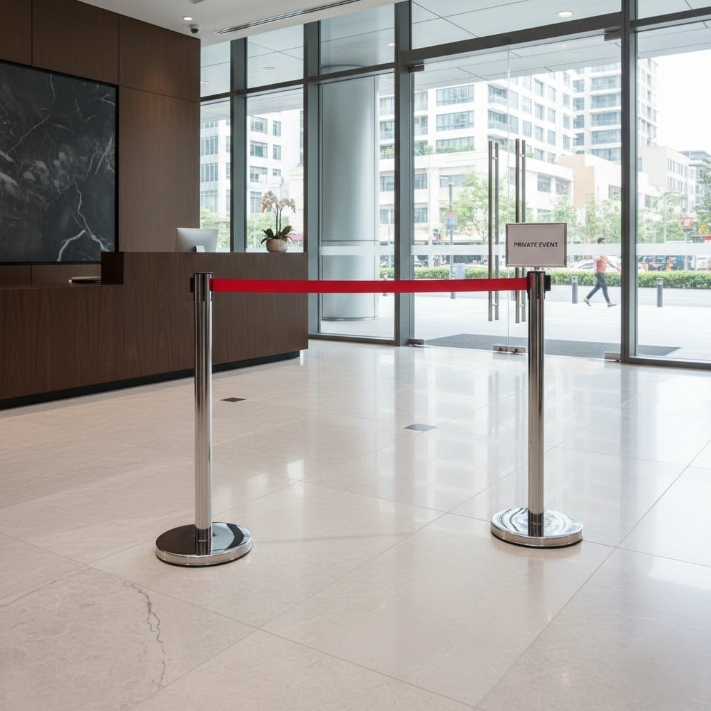 Мобильность и простота использования: Стойки легко переставляются, позволяя оперативно изменять схему прохода в зависимости от текущих задач — от разделения очередей до ограничения доступа в служебные зоны.
