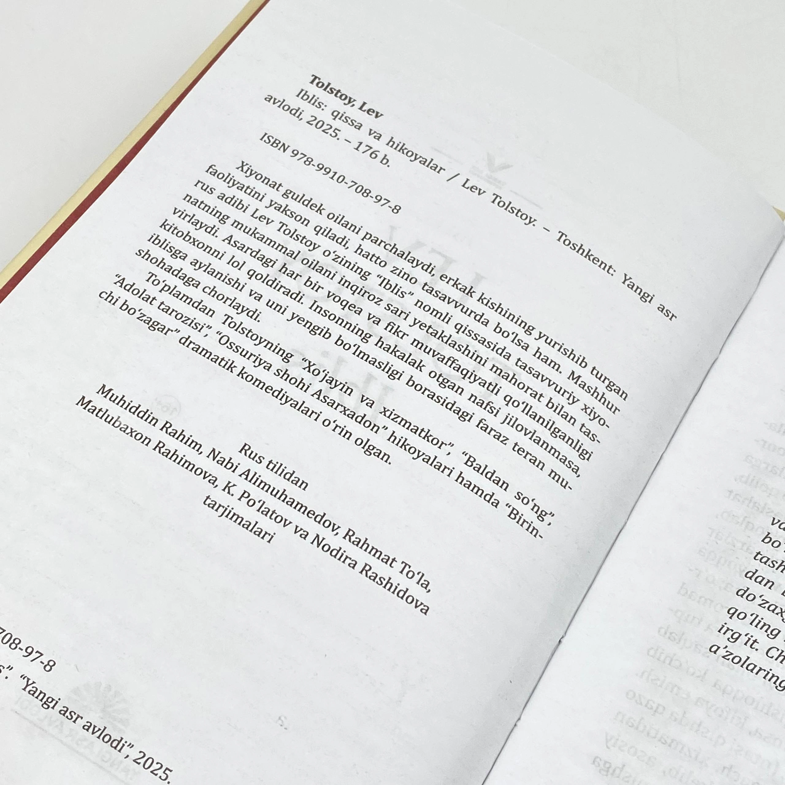 To‘plamdan Tolstoyning "Xo‘jayin va xizmatkor", "Baldan so‘ng", "Adolat tarozisi", "Ossuriya shohi Asarxadon" hikoyalari hamda "Birinchi bo‘zag‘ar" dramatik komediyalari o‘rin olgan.