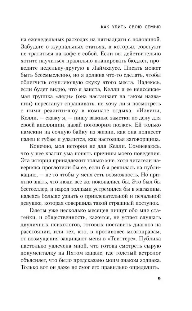 Когда я думаю о том, что сделала, мне становится немного грустно. Грустно, что никто никогда не узнает, какой хитроумный план я провернула. Конечно, мир содрогнулся бы в ужасе! Им не понять, как юная девушка может спокойно убить нескольких членов своей семьи... а потом счастливо прожить остаток дней, ни о чем не сожалея. У меня это получилось. Ну, почти. По иронии судьбы я сижу в тюрьме за убийство, которого не совершала. Полный бред!