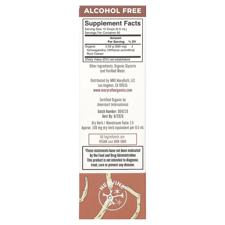 MaryRuth’s organik suyuq ashwagandha ildiz ekstrakti samarali adaptogen ta’sir ko‘rsatadi. Har bir porsiya (15 tomchi, 0,5 ml) 590 mg organik ashwagandha ekstrakti (Withania somnifera) ni o‘z ichiga oladi. Ushbu o‘simlik asrlar davomida an’anaviy Ayurveda tibbiyotida tana tabiiy muvozanatini saqlash va stress darajasini kamaytirish uchun ishlatilgan.
