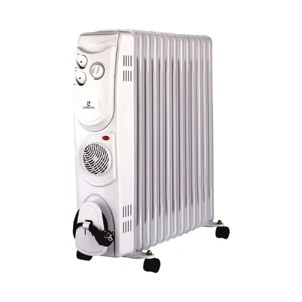 Масляный обогреватель LORETTO LFW-13 — это мощное и надёжное решение для обогрева вашего дома, сочетающее эффективность, безопасность и удобство: 13 секций и мощность 2900 Вт обеспечивают быстрый и равномерный прогрев помещения, создавая уют и комфорт даже в самые холодные дни, а встроенный вентилятор мощностью 400 Вт ускоряет циркуляцию тёплого воздуха для мгновенного тепла; регулируемый термостат позволяет точно поддерживать температуру, система защиты от перегрева и индикаторная лампа гарантируют безопасное использование, а такие мелочи, как держатель для кабеля, ролики для лёгкого перемещения, сушилка для белья и удобная ручка, делают эксплуатацию максимально комфортной — LORETTO LFW-13 это ваш надёжный источник тепла и уюта на каждый день.