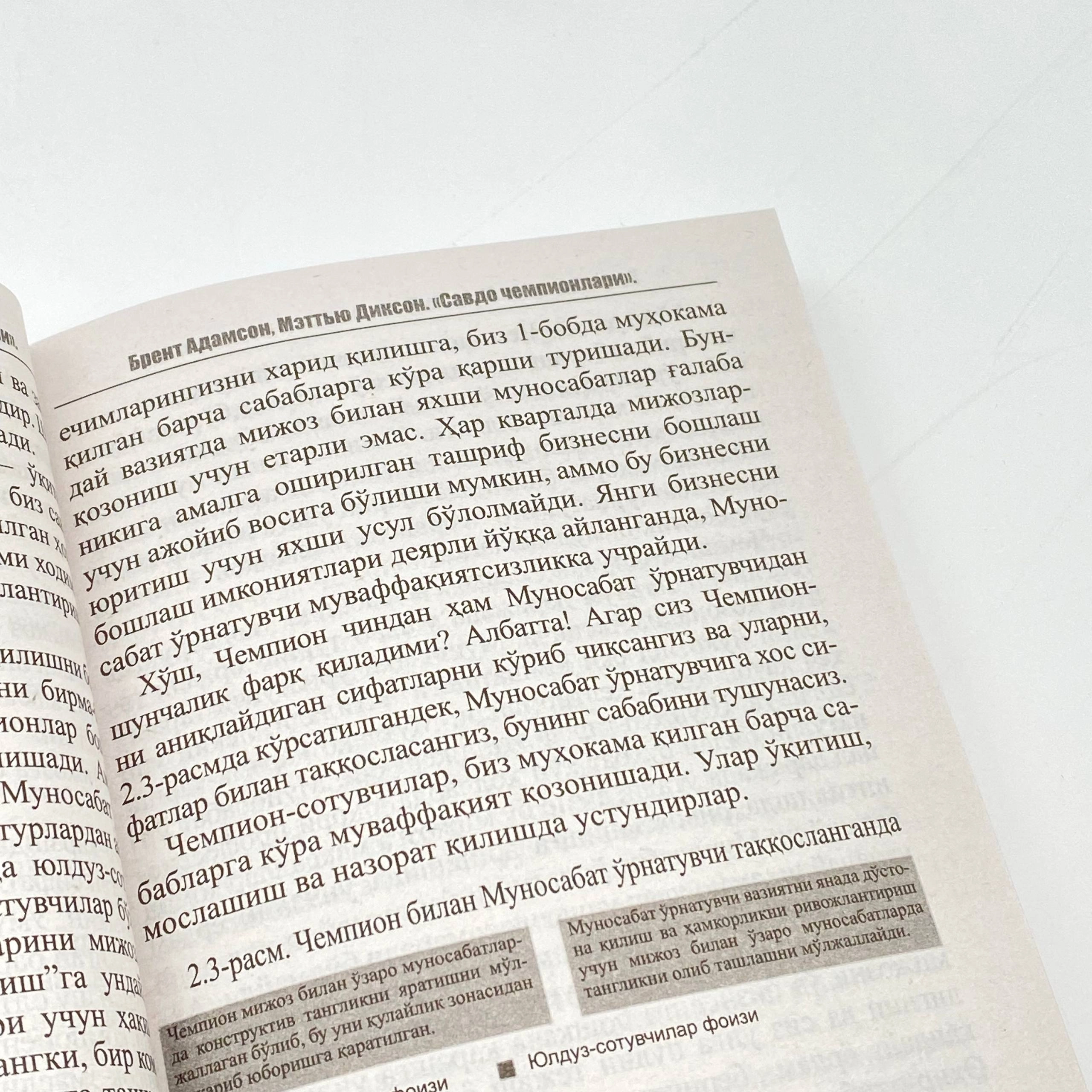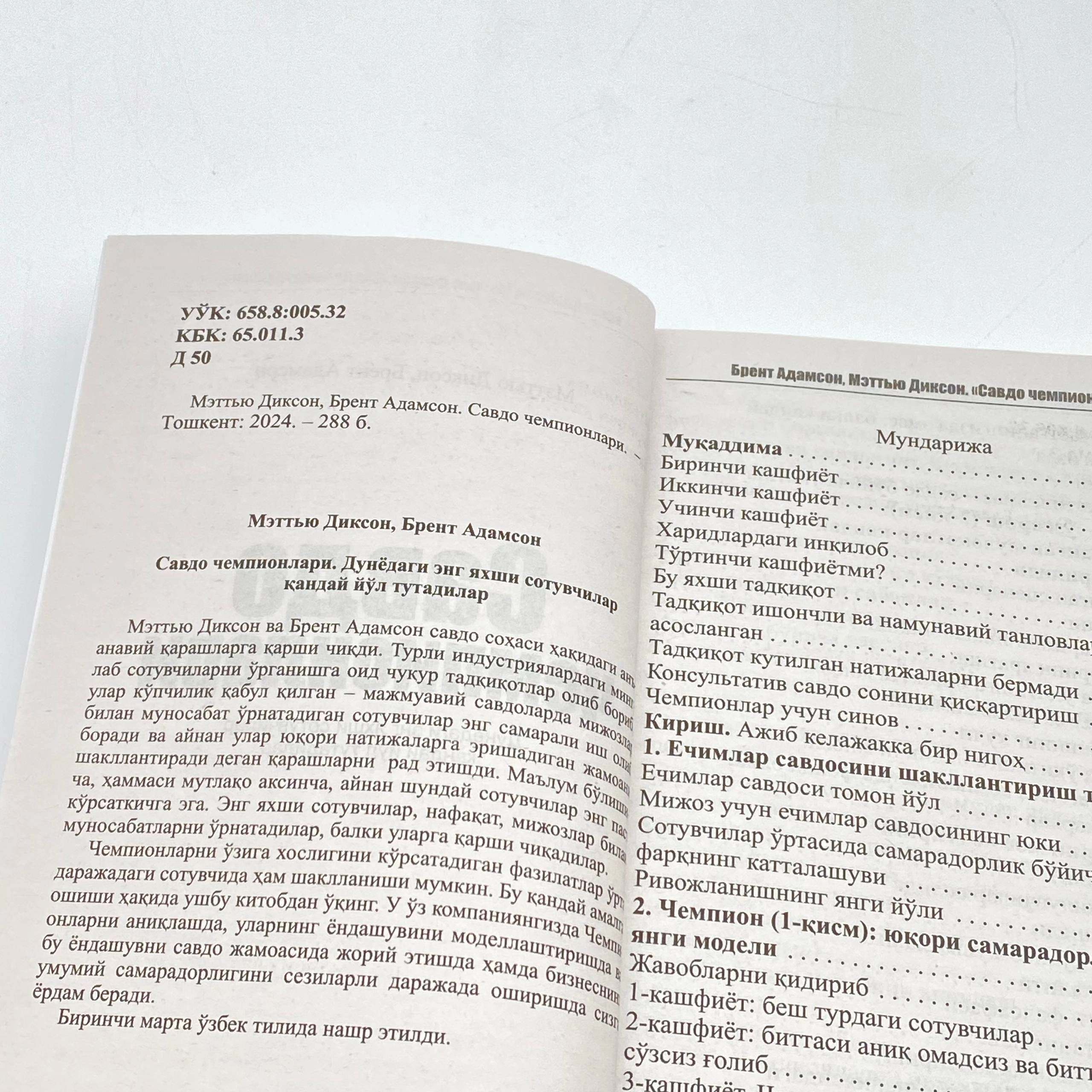 Chempionlarni o‘ziga xosligini ko‘rsatadigan fazilatlar o‘rta darajadagi sotuvchida ham shakllanishi mumkin. Bu qanday amalga oshishi haqida ushbu kitobdan O‘qing. U o‘z kompaniyangizda Chempionlarni aniqlashda, ularning yondashuvini modellashtirishda va bu yondashuvni savdo jamoasida joriy etishda hamda biznesning umumiy samaradorligini sezilarli darajada oshirishda sizga yordam beradi.