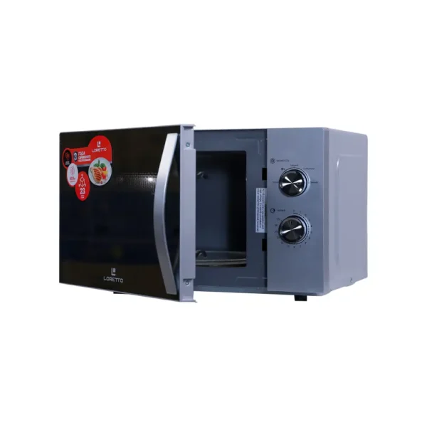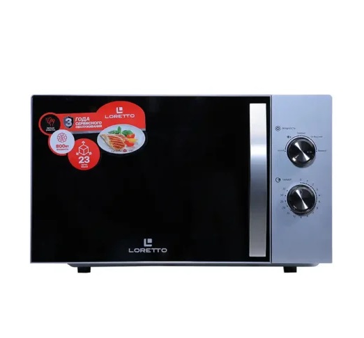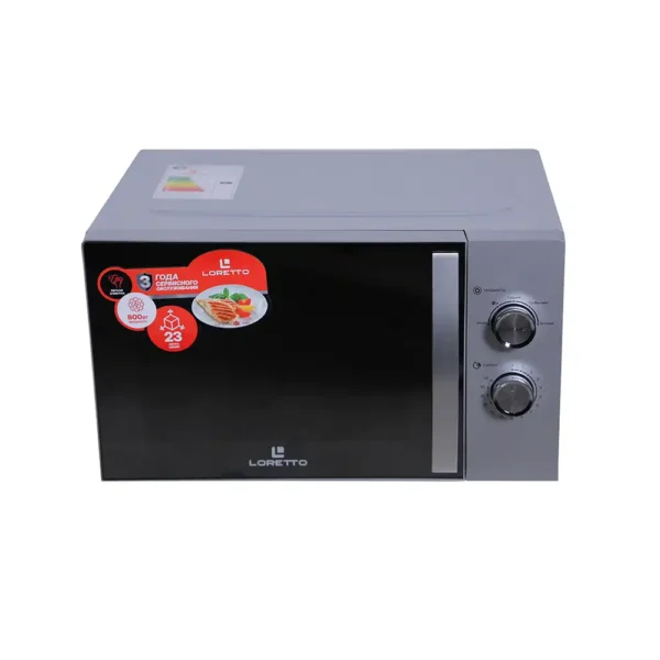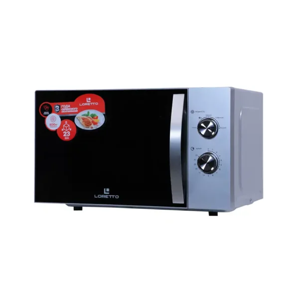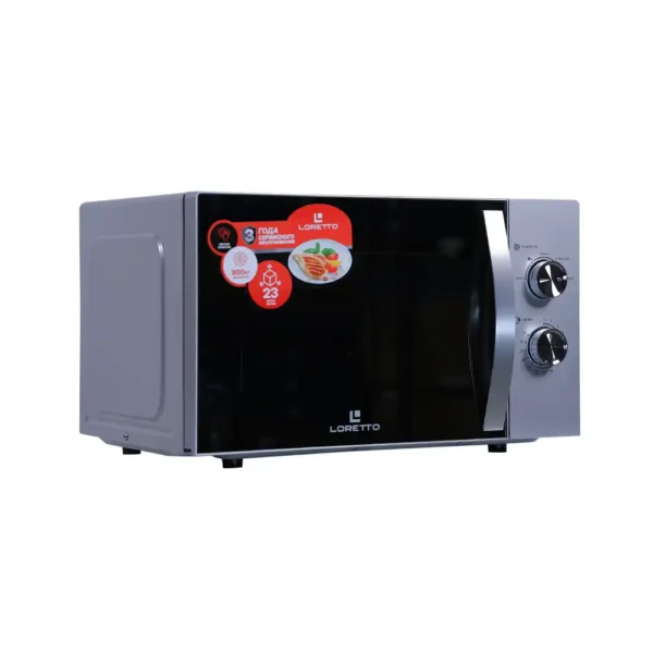 Микроволновая печь LORETTO LM-2301S — идеальное сочетание практичности и элегантного дизайна: серебристый корпус с полностью чёрным стеклом придаёт универсальный стиль, подходящий для любой кухни, увеличенный внутренний объём 23 литра позволяет использовать крупную посуду, мощность 800 Вт обеспечивает быстрый и равномерный разогрев, механическое управление с двумя поворотными ручками просто и надёжно регулирует время и уровень мощности, стеклянный поднос диаметром 270 мм обеспечивает стабильное вращение блюд, а энергоэффективность класса А делает использование прибора экономичным, превращая LORETTO LM-2301S в стильного и надёжного помощника на вашей кухне.