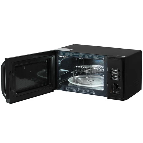 Управление печью реализовано через поворотный регулятор и кнопочную панель, а таймер позволяет устанавливать время до 99 минут. Модель имеет 6 уровней мощности микроволн, подсветку камеры, звуковой сигнал и часы, а дверца открывается удобно с помощью ручки. Внутреннее покрытие камеры выполнено из биокерамической эмали, что облегчает уход и делает работу печи безопасной для продуктов.