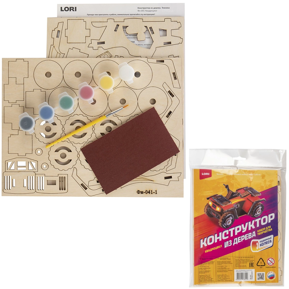 Ребёнок сможет собрать крутой квадроцикл из деревянных деталей. Готовую модель можно раскрасить акриловыми красками, входящими в комплект.