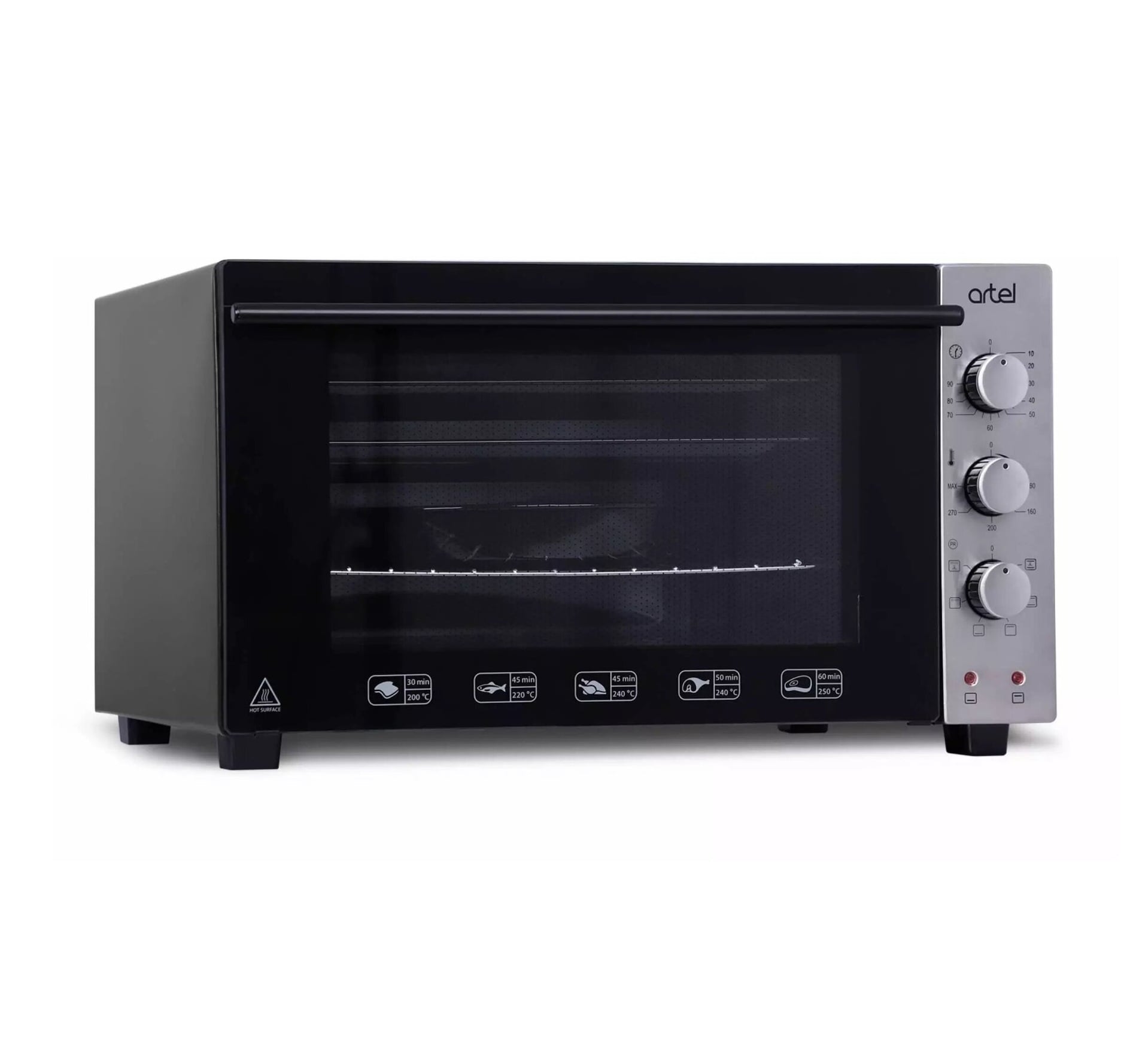 Artel ART-4203 поддерживает несколько режимов нагрева (3 режима), включая гриль, что расширяет возможности для приготовления разнообразных блюд. Комплектация включает эмалированный прямоугольный противень, глубокий круглый противень и решетку, а откидная дверца облегчает доступ к блюдам во время готовки.