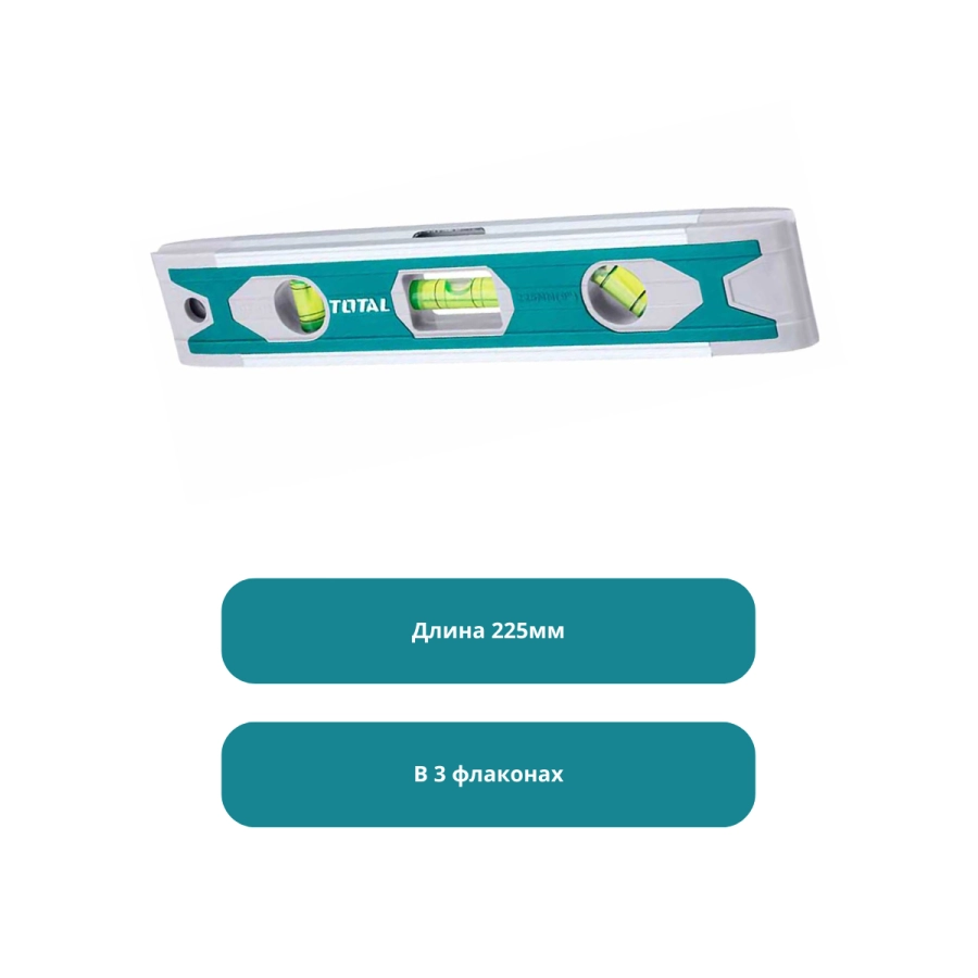 Кичик, бироқ ишончли — TOTAL TMT2235 миниатюр спиртовой уровени қурилиш, таъмирлаш ва безатиш ишларида сизга ишончли кўмакчи бўлади. Узунлиги ҳамма жойда ўзини оқлайди — бор-йўғи 225 мм, у осонликча асбоб қутисида ёки сумкада жой олади, лекин аниқликдан ютқазмайди.
