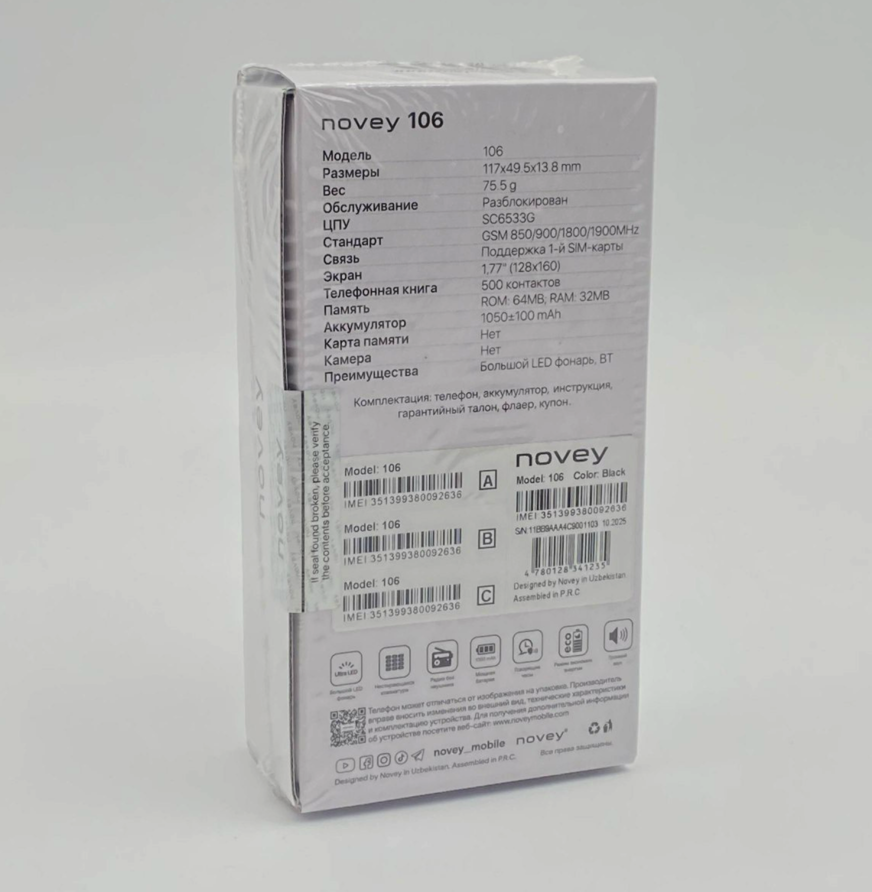 Novey 106 — отличный выбор для тех, кто ищет простой, долговечный и удобный кнопочный телефон.