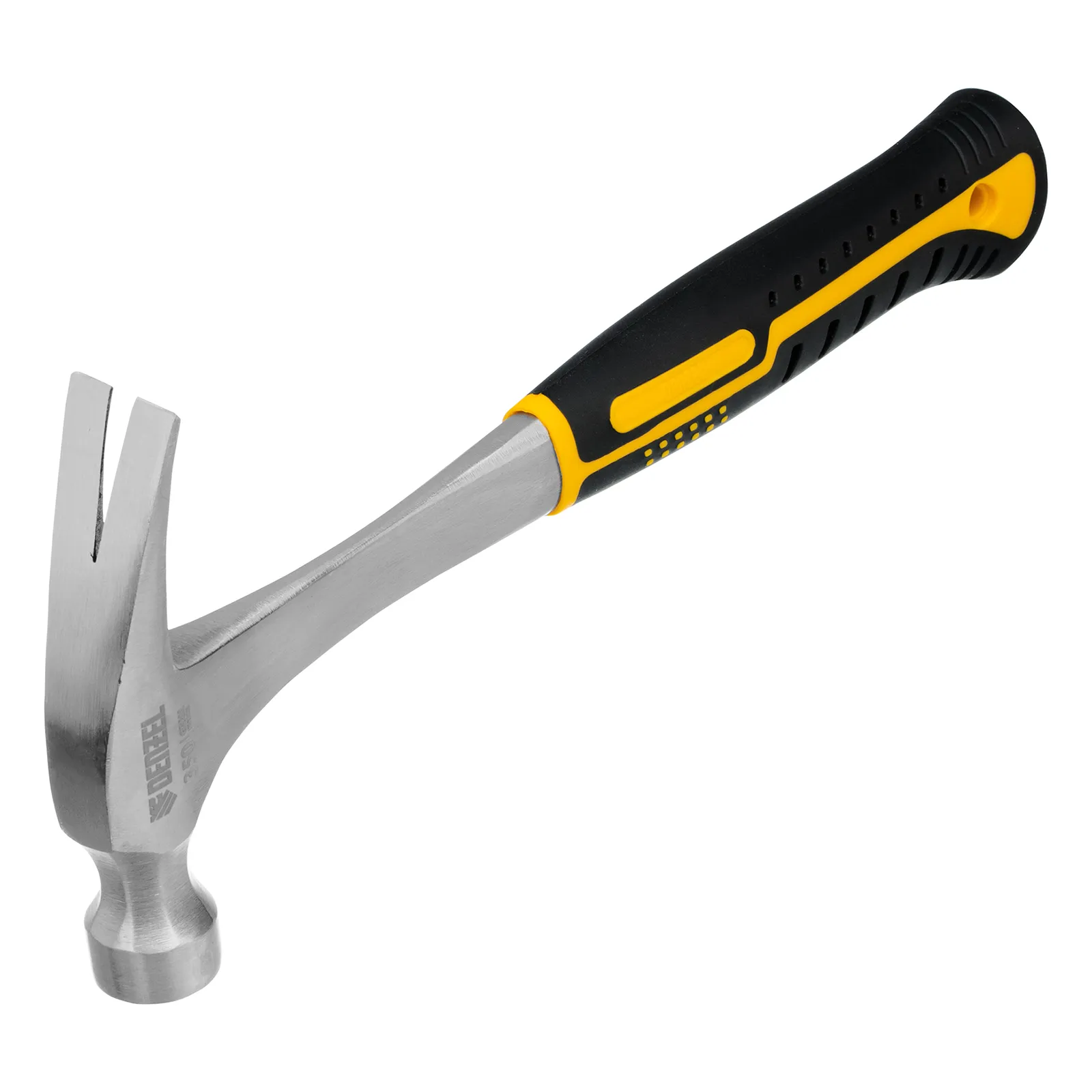 Молоток оснащён металлической рукояткой с пластиково-резиновым покрытием. Противоскользящая поверхность обеспечивает уверенный хват, а резиновая вставка гасит вибрации и снижает нагрузку на кисть и суставы. Это делает работу комфортной даже при длительном использовании.
