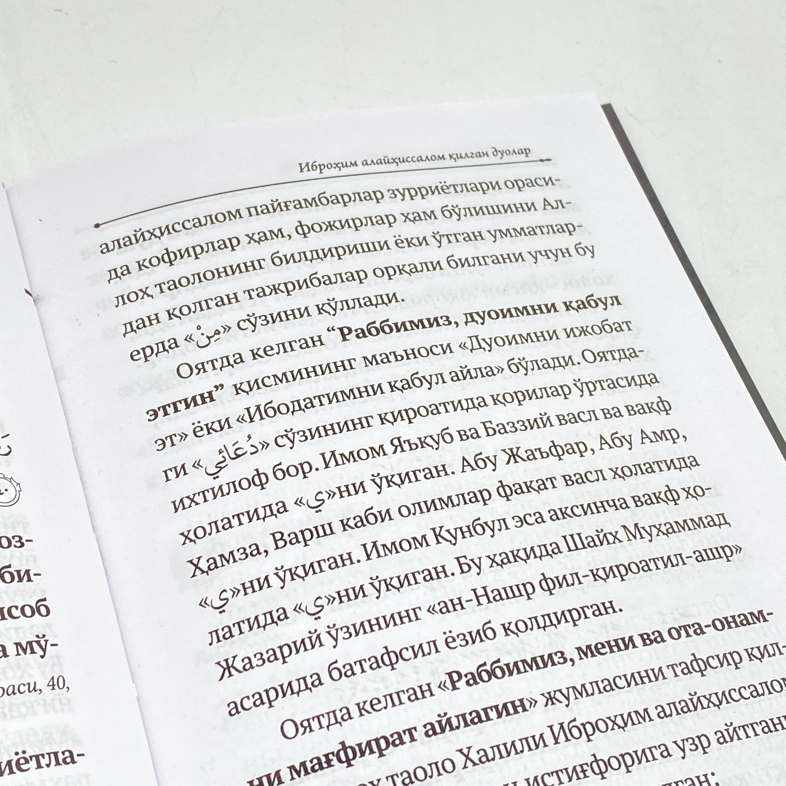 Ушбу асарда Аллоҳ таолонинг Каломида келган улуғ расуллар, пайғамбаримиз Муҳаммад соллаллоҳу алайхи ва саллам, олдинги умматлардан бўлган солиҳ бандалар тилларидан айтилган дуолар жамланган. Мазкур дуолар осон услуб билан тафсир қилинган. Бу дуолар жуда аҳамиятли бўлиб, ҳар бир мусулмон уларни ўрганиб ўқиб юрса, Аллоҳнинг розилигига етишишига сабаб бўлади, деб умид қиламиз. Бу билан У пайғамбарлар ва солиҳ инсонларга эргашган бўлади.