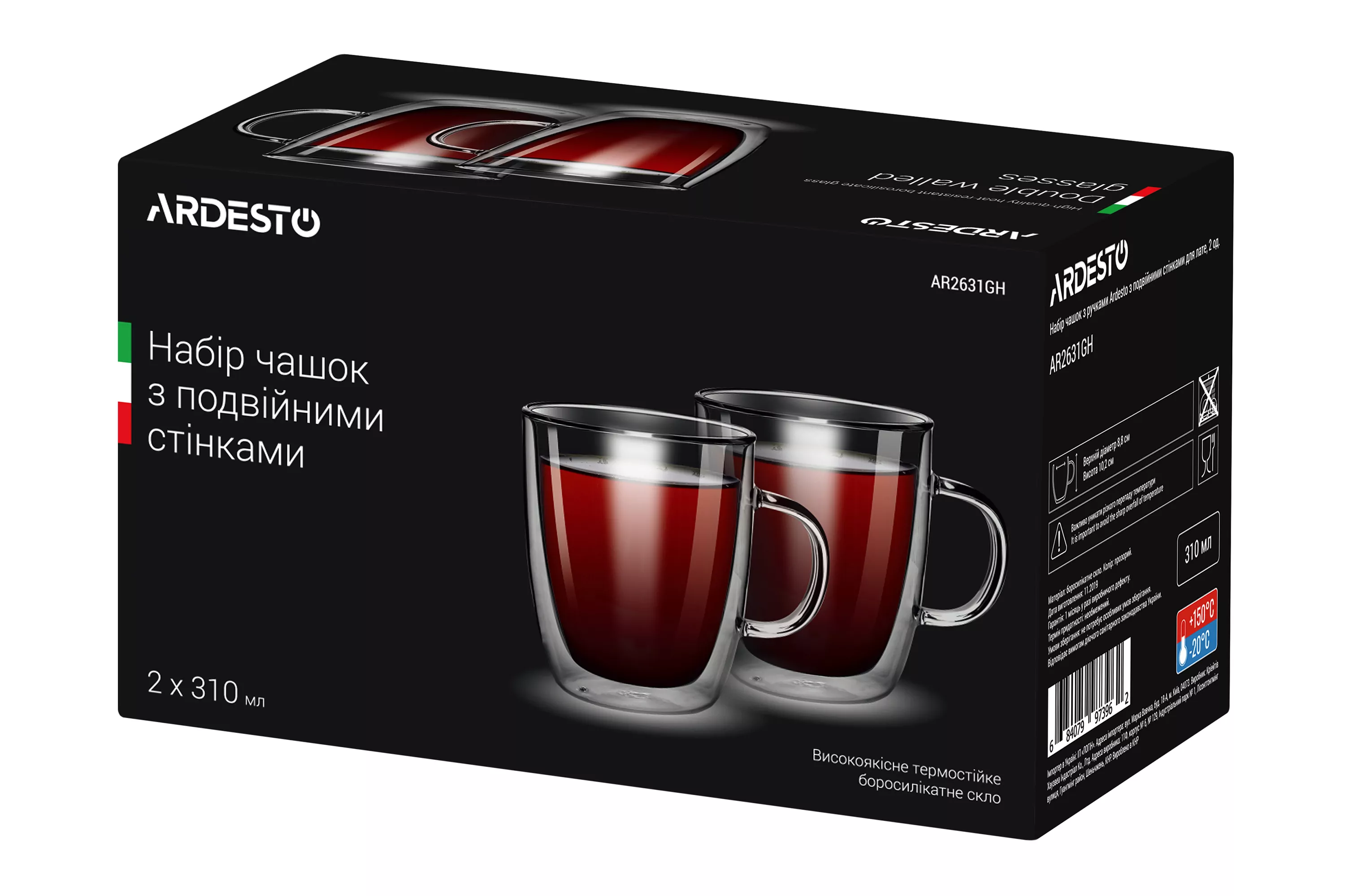 Стильные и практичные чашки ARDESTO с двойными стенками делают каждую паузу за кофе или чаем особенной. В набор входят 2 чашки объёмом 310 мл каждая — идеальный размер для латте, капучино или любого горячего напитка.