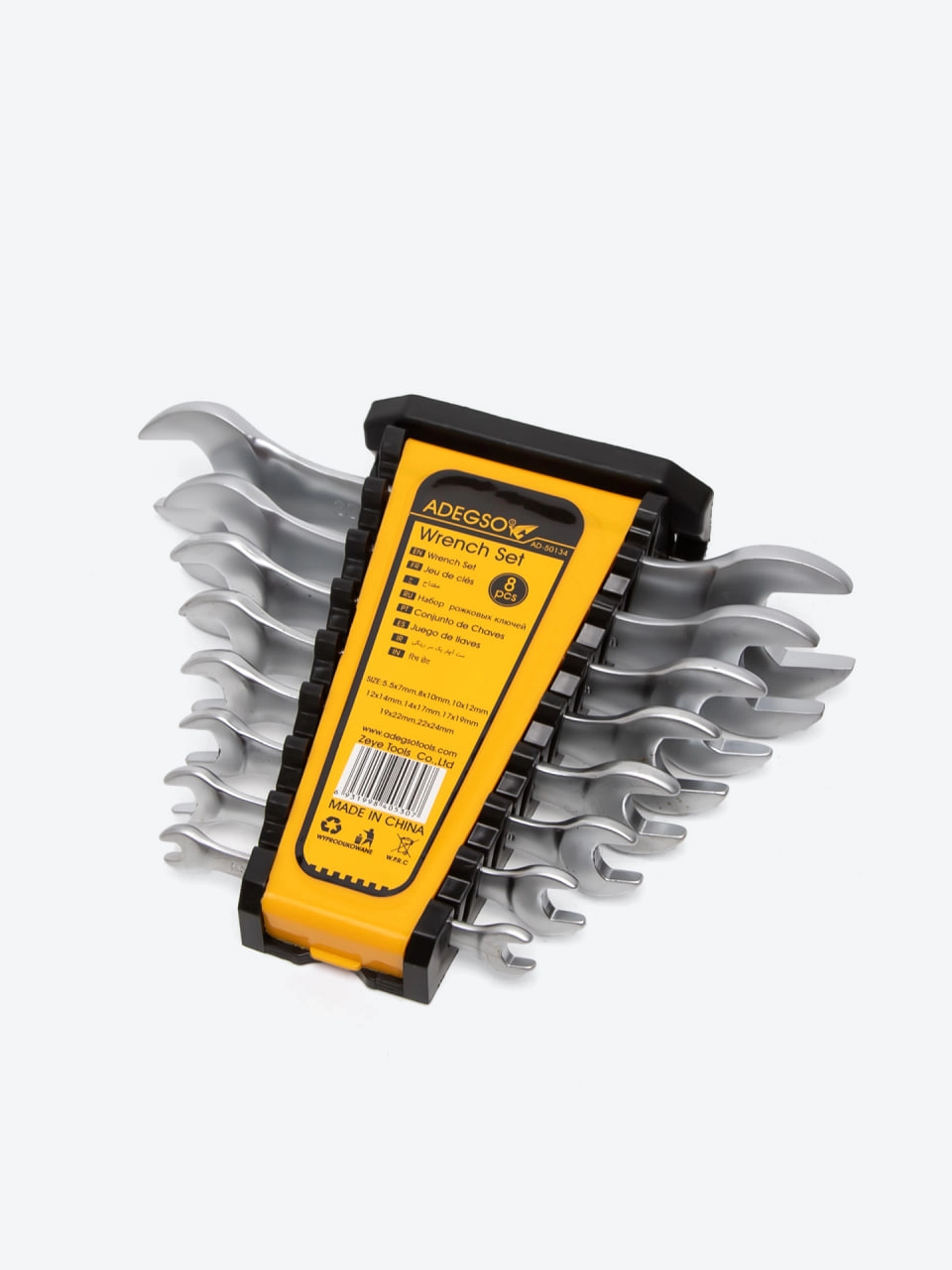 Adegso AD-50134 — bu eng ko‘p ishlatiladigan o‘lchamdagi 8 ta kombinatsiyalangan gayka kaliti dan iborat amaliy to‘plam. Kalitlar mustahkam va zangga chidamli xrom-vanadiy po‘latidan ishlab chiqarilgan.