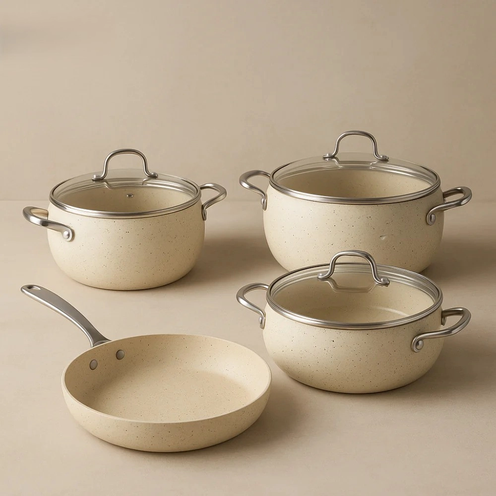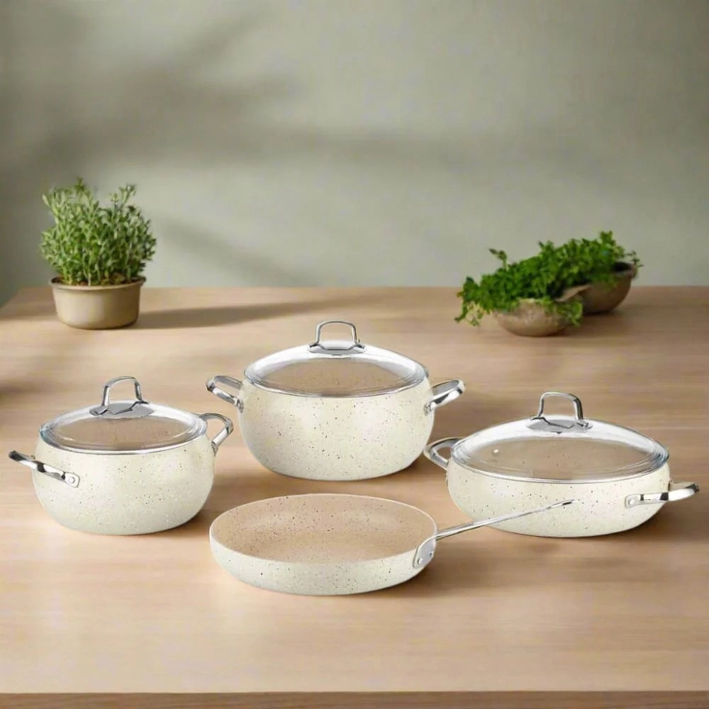 Ushbu to‘plam yordamida har qanday taomni qaynatish, dimlash, qovurish va isitish mumkin. Silliq yopishmaydigan qoplama kuyishni oldini oladi va minimal miqdordagi yog‘ bilan pishirish imkonini beradi, shu bilan birga mahsulotlarning ta’mi va foydasi saqlanadi. Idishlar tez va bir tekis qiziydi, ergonomik tutqichlar esa qulay foydalanishni ta’minlaydi.