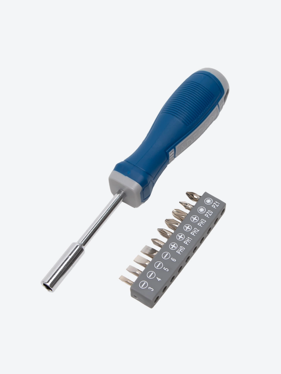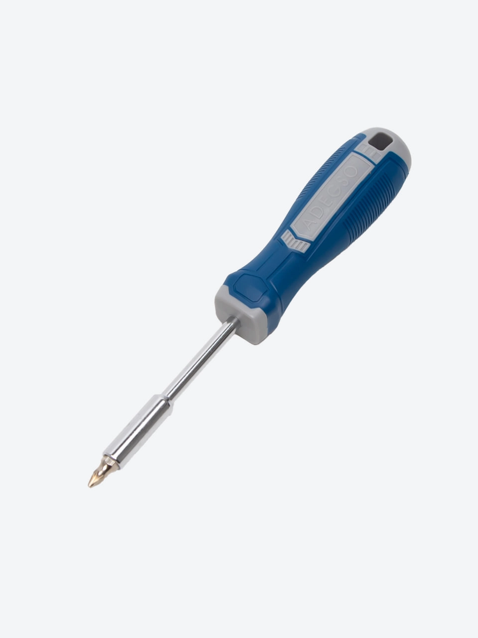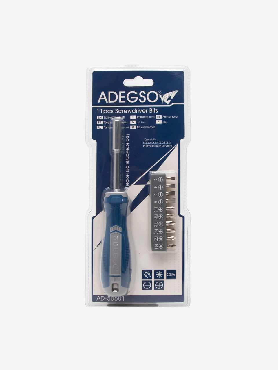 ADEGSO AD-50501 — bu 11 ta buyumdan iborat amaliy otvyortka-bits to‘plami bo‘lib, qulay tutqich bilan birga keladi. Maishiy texnika, elektronika, mebel va boshqa ta’mirlash ishlarida qo‘l keladi.