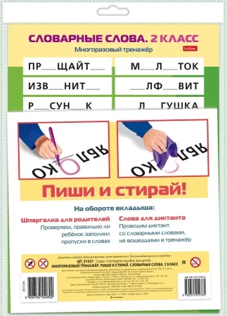 Наглядное пособие «Многоразовый тренажер — Пиши и стирай» предназначено для учеников 2 класса и помогает эффективно закреплять написание слов русского языка. Многоразовая поверхность позволяет писать и стирать, повторяя задания многократно, что делает обучение увлекательным и продуктивным.