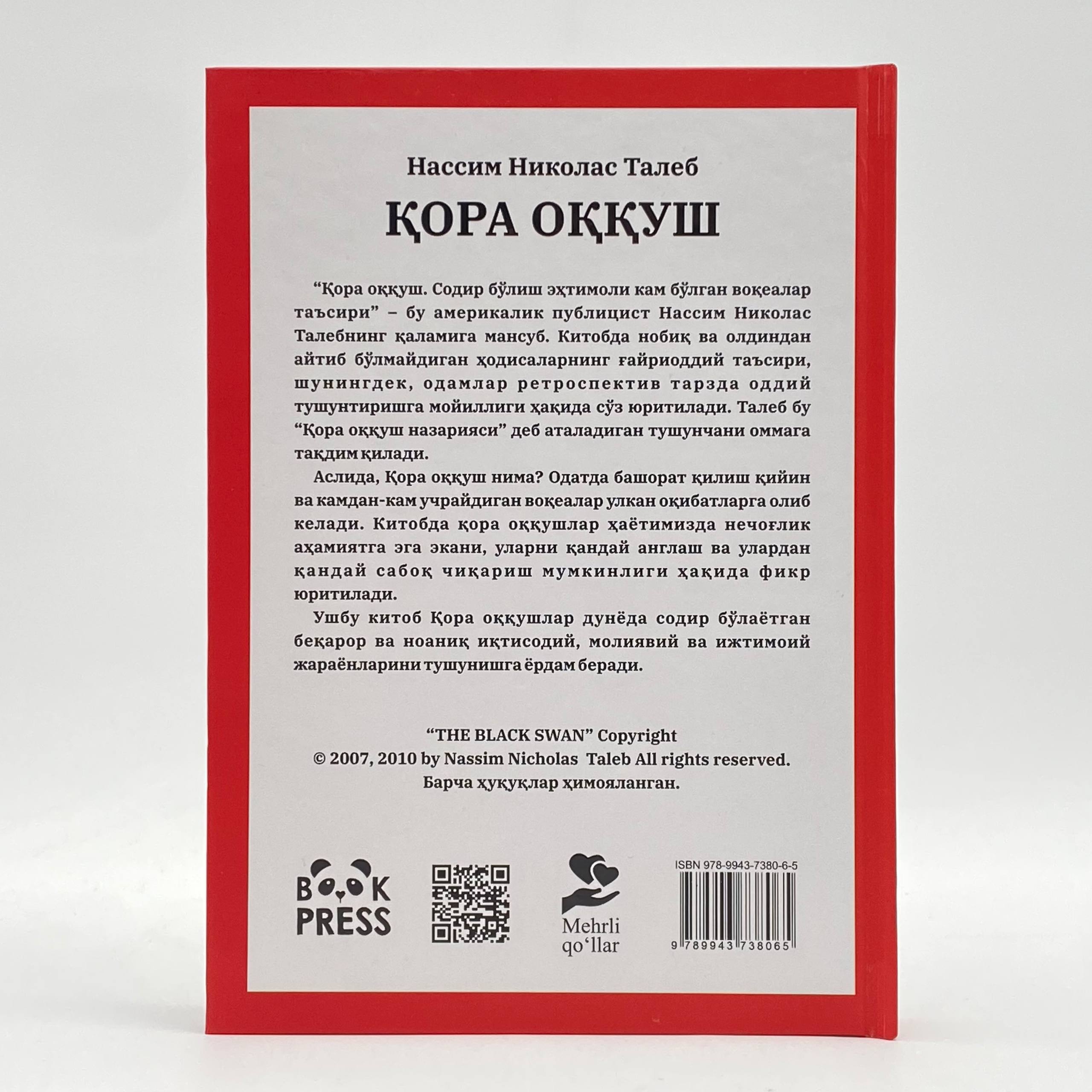 Сиёсатда Қора оққуш нима? Олдиндан башорат қилиш қийин ва камдан- кам учрайдиган воқеалар муҳим оқибатларга олиб келади. Китобда қора оққушлар табиатда ноёб ҳисобланганидек, башоратчилар аслида бундай маҳоратга эга эмаслиги, улар имконсиз нарсалар ҳақида гапиришлари мисоллар орқали ёритиб берилади.