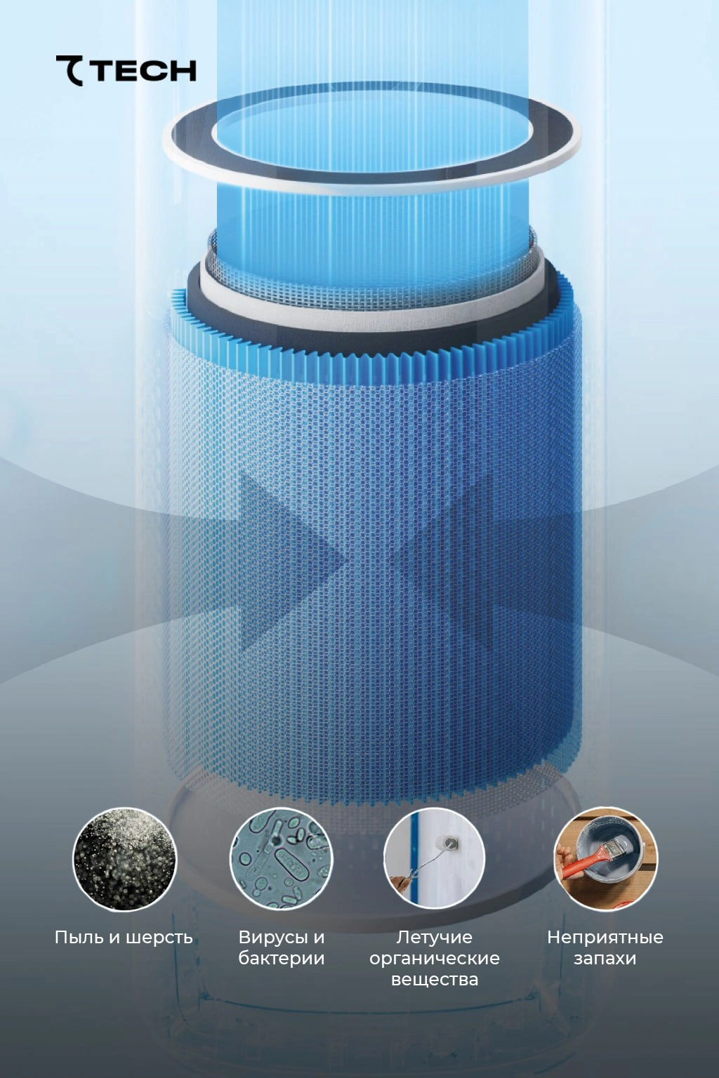 CADR 650 kub.m/soat tezlikda havoni tozalash orqali chang, uy hayvonlari junlari, viruslar va bakteriyalar, uchuvchi organik birikmalar va yoqimsiz hidlarni tezda yo‘q qiladi. Yuqori sifatli HEPA H13 filtr eng mayda zarralarni ham tutib qoladi va havoni allergiyadan va mikroblardan himoya qiladi.