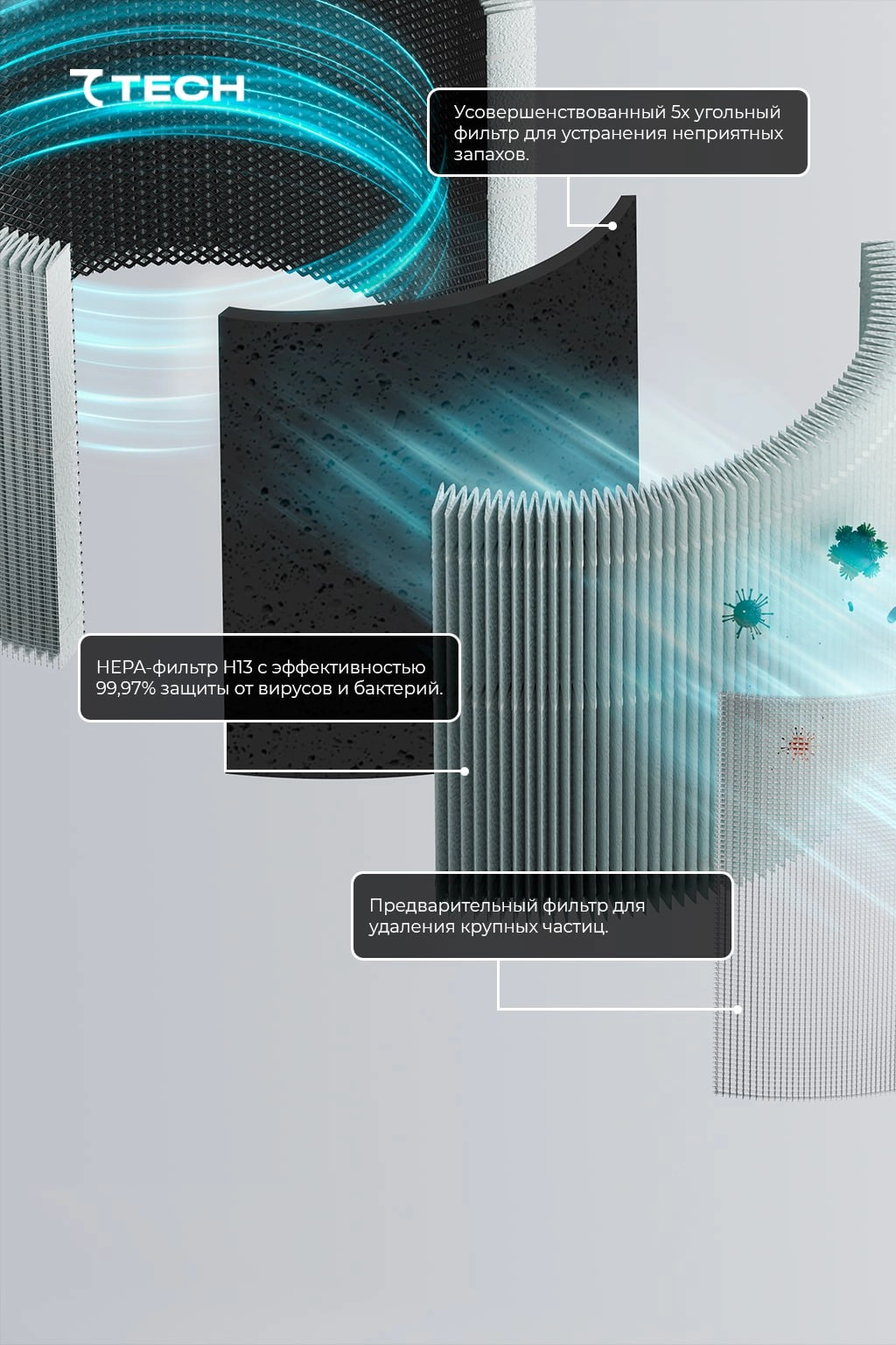 Filtrlash tizimining asosini H13 toifasidagi HEPA-filtr tashkil etadi. U viruslar, bakteriyalar, allergenlar va eng mayda chang zarrachalarining 99,97% gacha qismini ushlab qoladi. Uni takomillashtirilgan 5 burchakli uglerodli filtr (Carbon Filter) to‘ldiradi — u yoqimsiz hidlar, tutun va zararli gazlarni samarali bartaraf etish uchun mo‘ljallangan. Oldindan filtrlash tizimi yirik zarrachalarni ushlab qolib, asosiy filtrlardan foydalanish muddatini uzaytiradi.