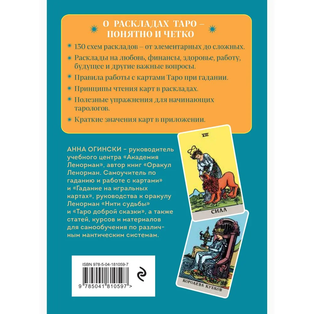 Более 100 раскладов Таро, помогающих ответить на самые разные вопросы, – в новой книге от Анны Огински, руководителя учебного центра "Академия Ленорман" и автора популярных книг-самоучителей по Таро и оракулу Ленорман. Здесь вы найдете множество раскладов на любовь, финансы, здоровье, работу, будущее и другие важные темы, познакомитесь с правилами гадания на Таро и принципами чтения раскладов и узнаете, какие нюансы следует учитывать при толковании карт. В полезных приложениях в конце книги вы найдете краткие значения всех карт Таро и таблицы-конструкторы для самостоятельного создания простейших раскладов на 2, 3 и 4 карты. Простое и понятное руководство по раскладам на картах Таро от Анны Огински, руководителя учебного центра «Академия Ленорман», автора книг и статей, специалиста по различным мантическим системам, поможет вам заглянуть в будущее и увидеть скрытые причины событий и поступков и найти ответы на важнейшие вопросы.