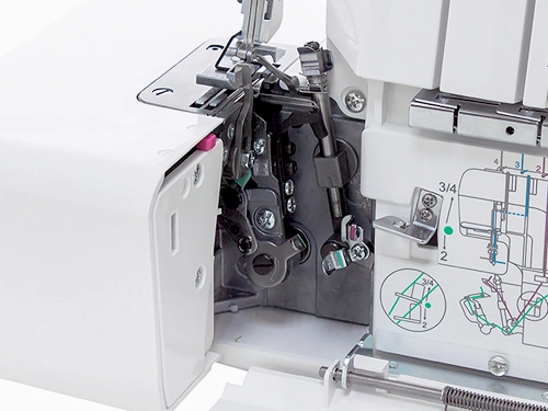 Оверлок позволяет шить 4, 3, а также 2 нитями с помощью специального конвертера. Регулировка натяжения нити, длины стежка, дифференциала транспортера и давления лапки поможет оптимально настроить машину и выполнить идеальный шов.