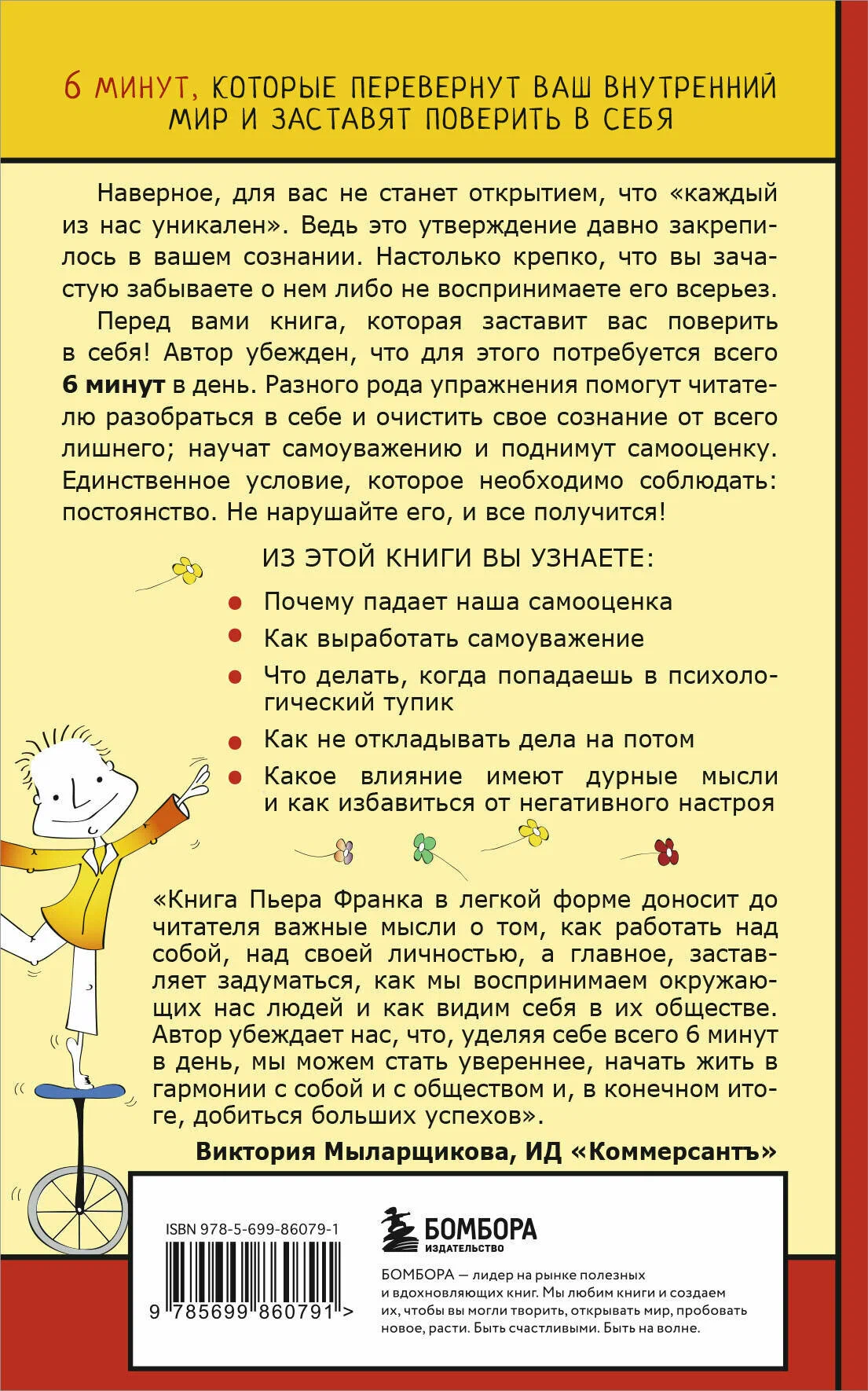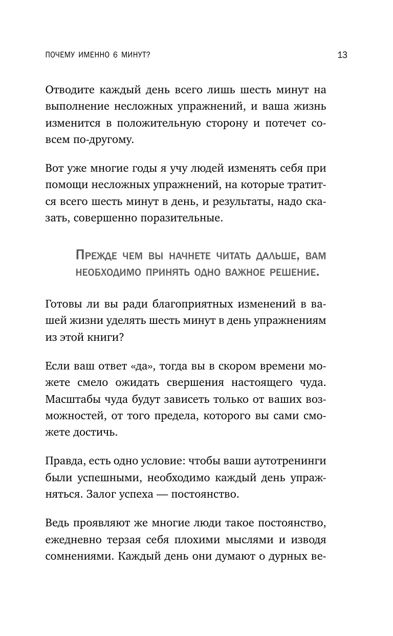Из этой книги читатель узнает, как избавиться от негативного настроя и сформировать положительное представление о себе; разобраться в своих недостатках и научиться пользоваться своими достоинствами. Перед вами не просто расплывчатая теория, а практические задания и полезные рекомендации; яркие примеры и простые упражнения. Благодаря 6-минутным занятиям в день вы станете на 100% уверенным в себе и своих силах.