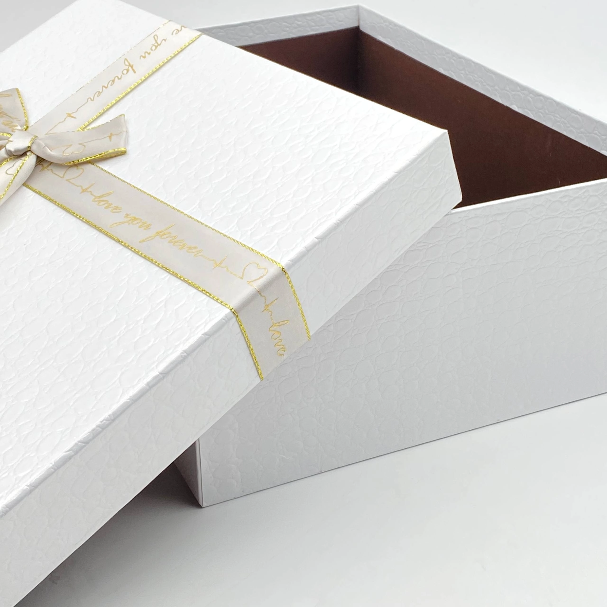 Zamonaviy va nafis ko‘rinishga ega quti sizning sovg‘angizni yanada jozibador qiladi. Mustahkam kartondan tayyorlangan bu quti kiyim-kechak, kosmetika, aksessuarlar, kitoblar va boshqa sovg‘alar uchun juda mos keladi.