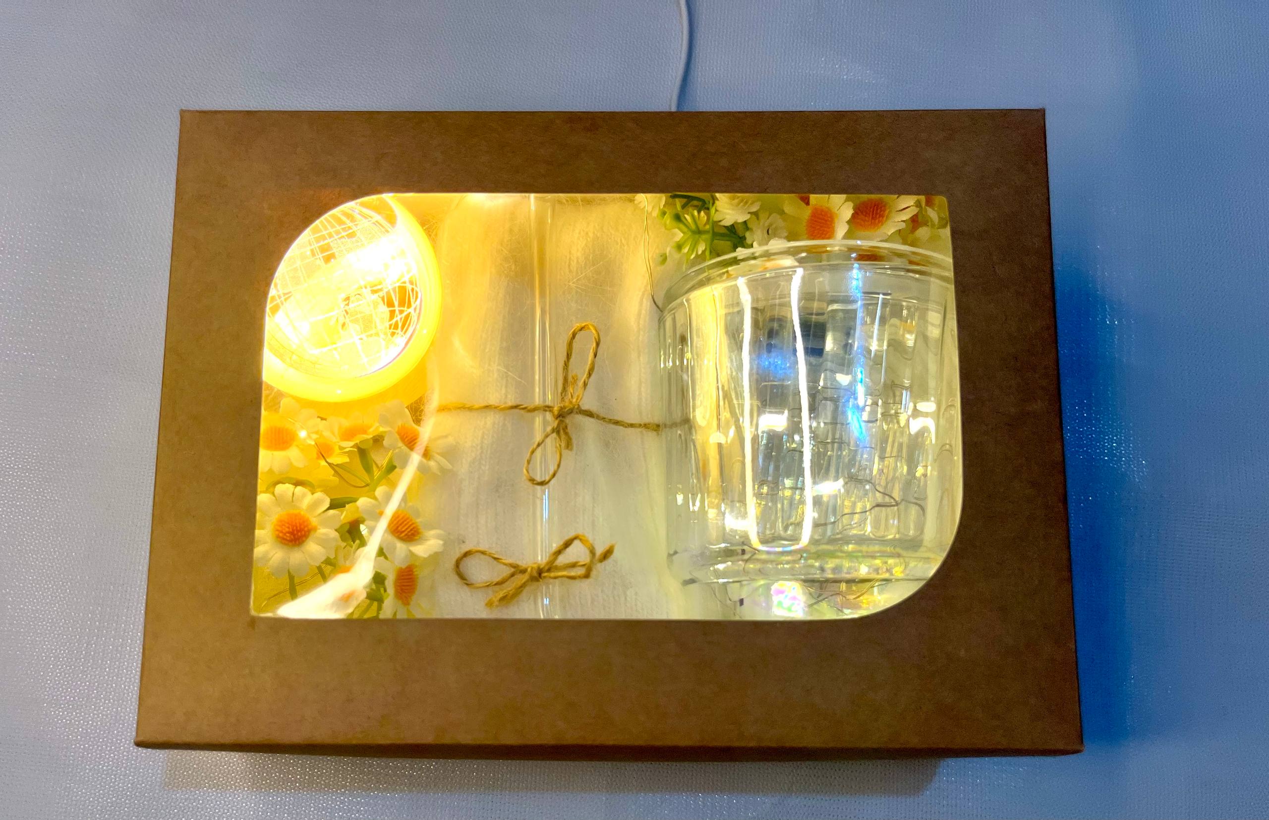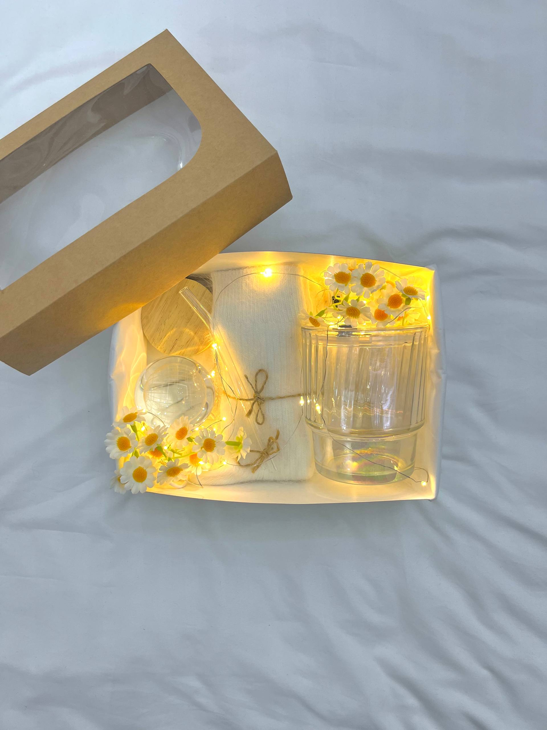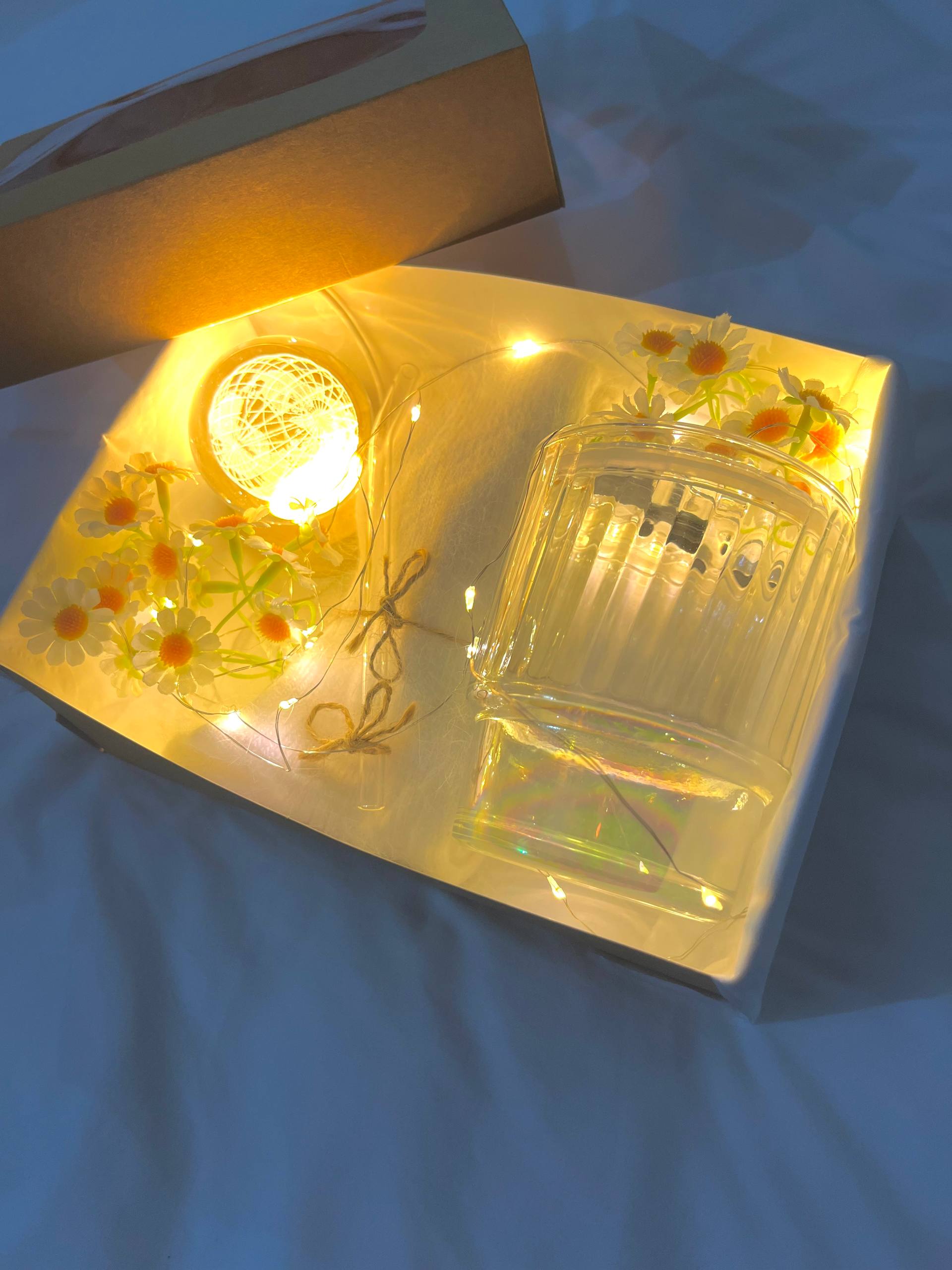 В набор входит декоративный ночник, нежные цветы, мягкие тёплые носочки, стеклянный стакан с трубочкой и мини-гирлянда, наполняющая пространство мягким светом.