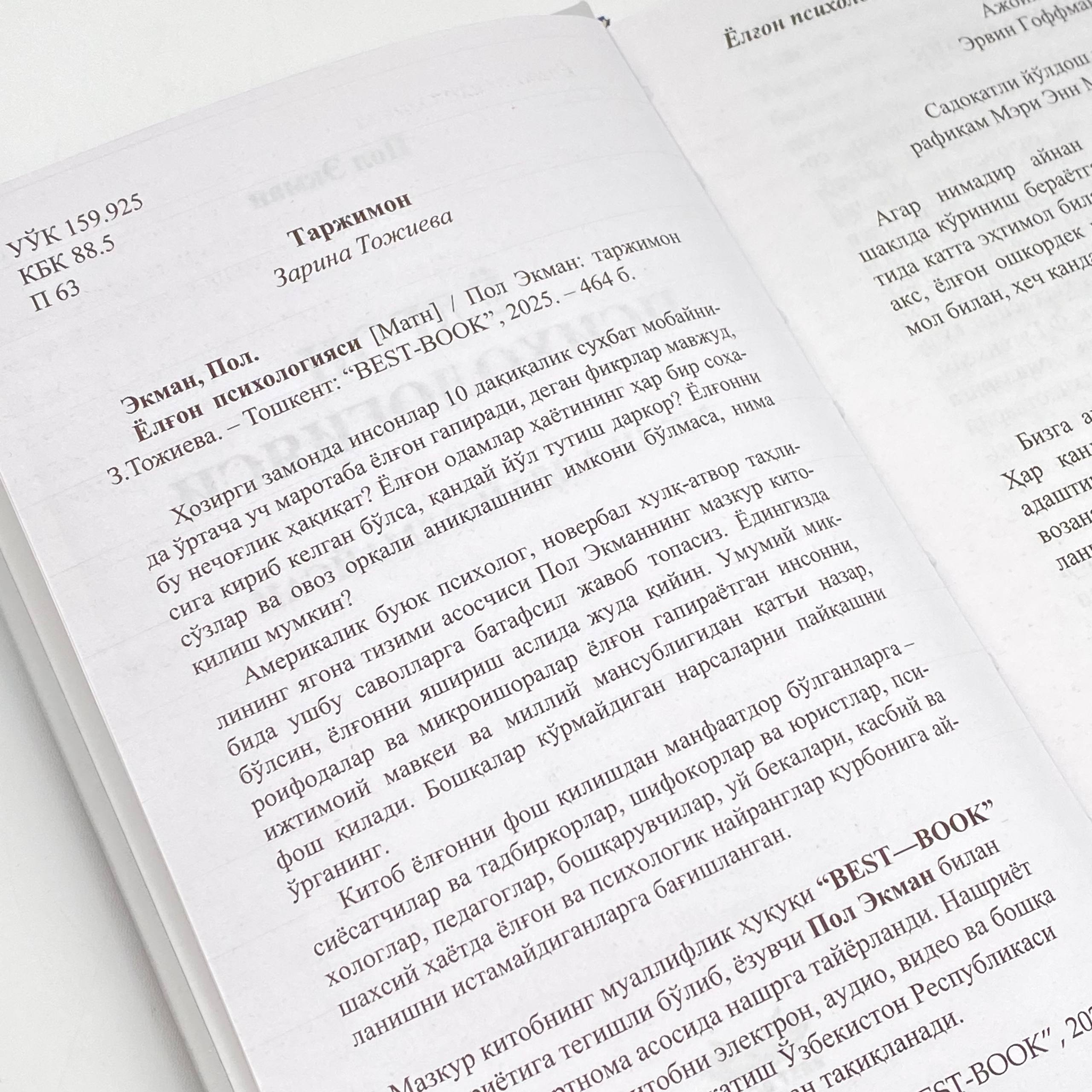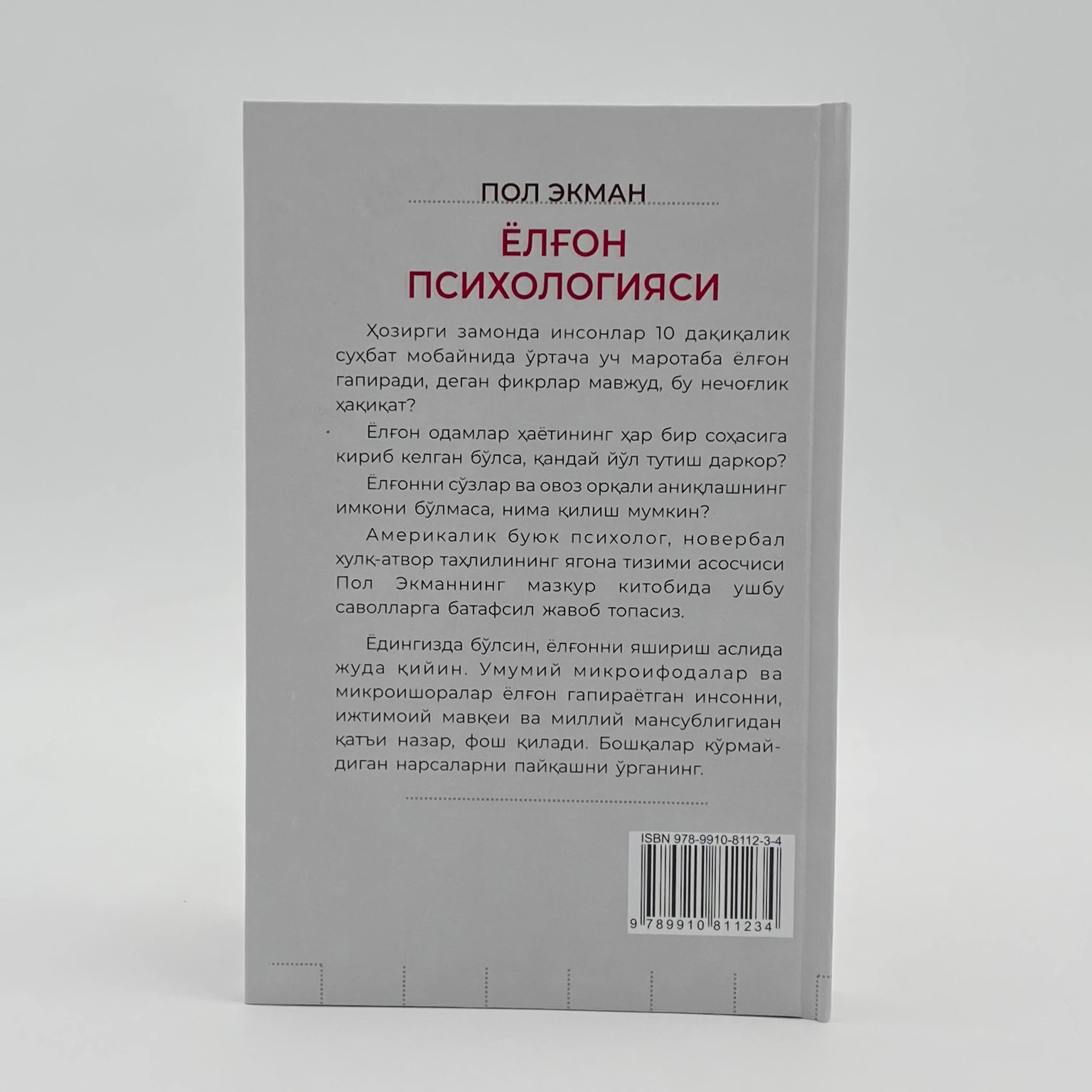 Замонавий одам ўн дақиқалик суҳбат ичида ўртача уч марта ёлғон гапириши тўғримикан? Ёлғон инсон ҳаётининг барча соҳаларига кириб борганига қандай муносабат билдирасиз? Агар сиз ёлғонни сўз ва овоздаги турланиш орқали ҳам аниқлай олмасангиз қандай йўл тутганингиз маъқул бўлади? Пол Экманнинг китобидан шундай саволларга муфассал жавоб топсиз. Унутманг, ёлғонни яшириш жуда қийин. Универсал ҳисобланувчи макроифодалар ва микро саъй-ҳаракат бўлган имо-ишоралар ҳар доим (ижтиомй ҳолати ва қайси миллатга мансублигидан қатъий назар) ёлғонни фош қилиб қўяди. Бошқалар илғамаган нарсаларга эътибор беришни ўрганинг.